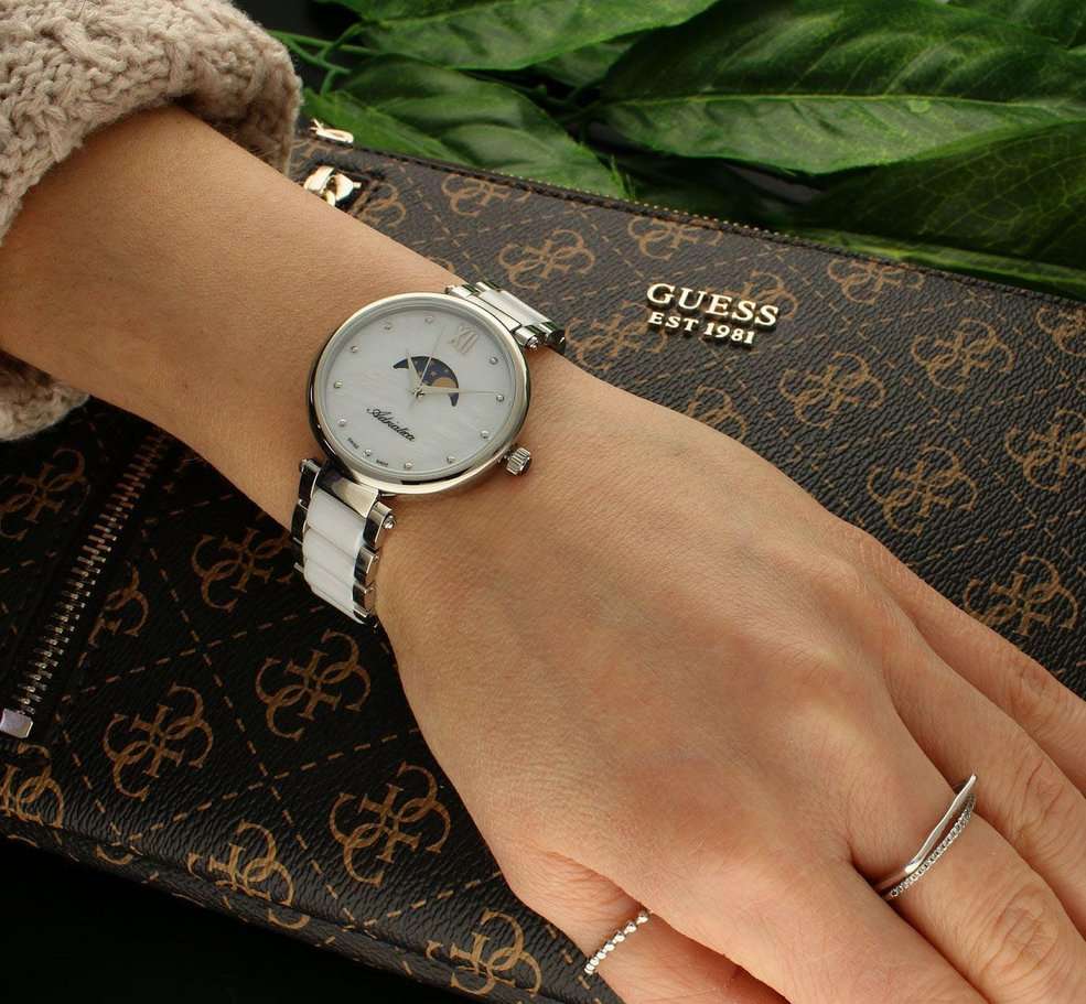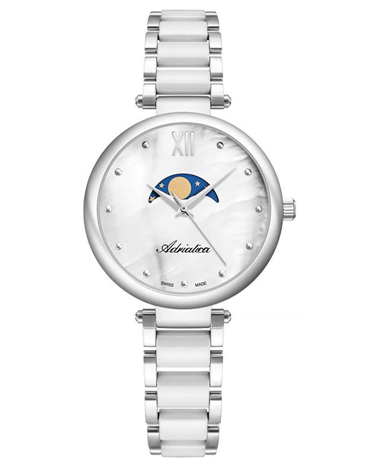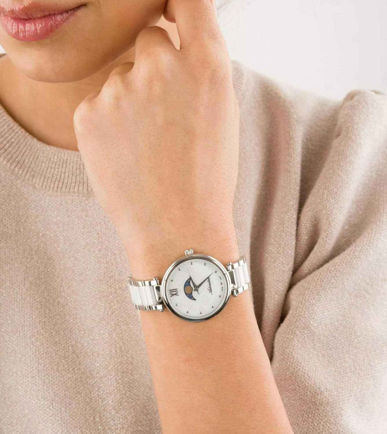 Женские часы Adriatica A3705.C18FQM представляют собой гармонию изысканности и функциональности, создавая идеальный аксессуар для тех, кто ценит качество и стиль. Эти швейцарские часы оснащены надежным кварцевым механизмом с калибром Ronda 788, который гарантирует точность и долговечность. Корпус, выполненный из нержавеющей стали, имеет диаметр 34 мм и толщину 7 мм, что придаёт ему утончённый и современный вид. Перламутровый белый циферблат, защищённый минеральным стекломМинеральное стеклоМинеральное стекло представляет собой искусственно выращенный минерал кварца. Такое стекло отличается особой устойчивостью к повреждениям и царапинам. Уступает по некоторым качествам сапфировому стеклу., добавляет элегантности и привлекает внимание. Особое внимание заслуживает браслет из нержавеющей стали с белыми биокерамическимиБиокерамикаБиокерамика — это материал, который на две трети состоит из керамики, на одну треть — из биопластика. Он сочетает в себе лучшие качества обоих материалов и обладает прочностью и шелковистой на ощупь текстурой. вставками, который обеспечивает комфорт и надёжность при носке, а ювелирная застёжка добавляет дополнительный акцент на изысканность. Функция отображения фазы луны придаёт часам уникальность и делает их не только стильным, но и функциональным аксессуаром. Водозащита уровня 50WR позволяет не беспокоиться о воздействии влаги, что увеличивает практичность часов в повседневной жизни. Часы Adriatica A3705.C18FQM — это символ швейцарского качества, сочетающий в себе современные технологии и классический дизайн.