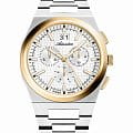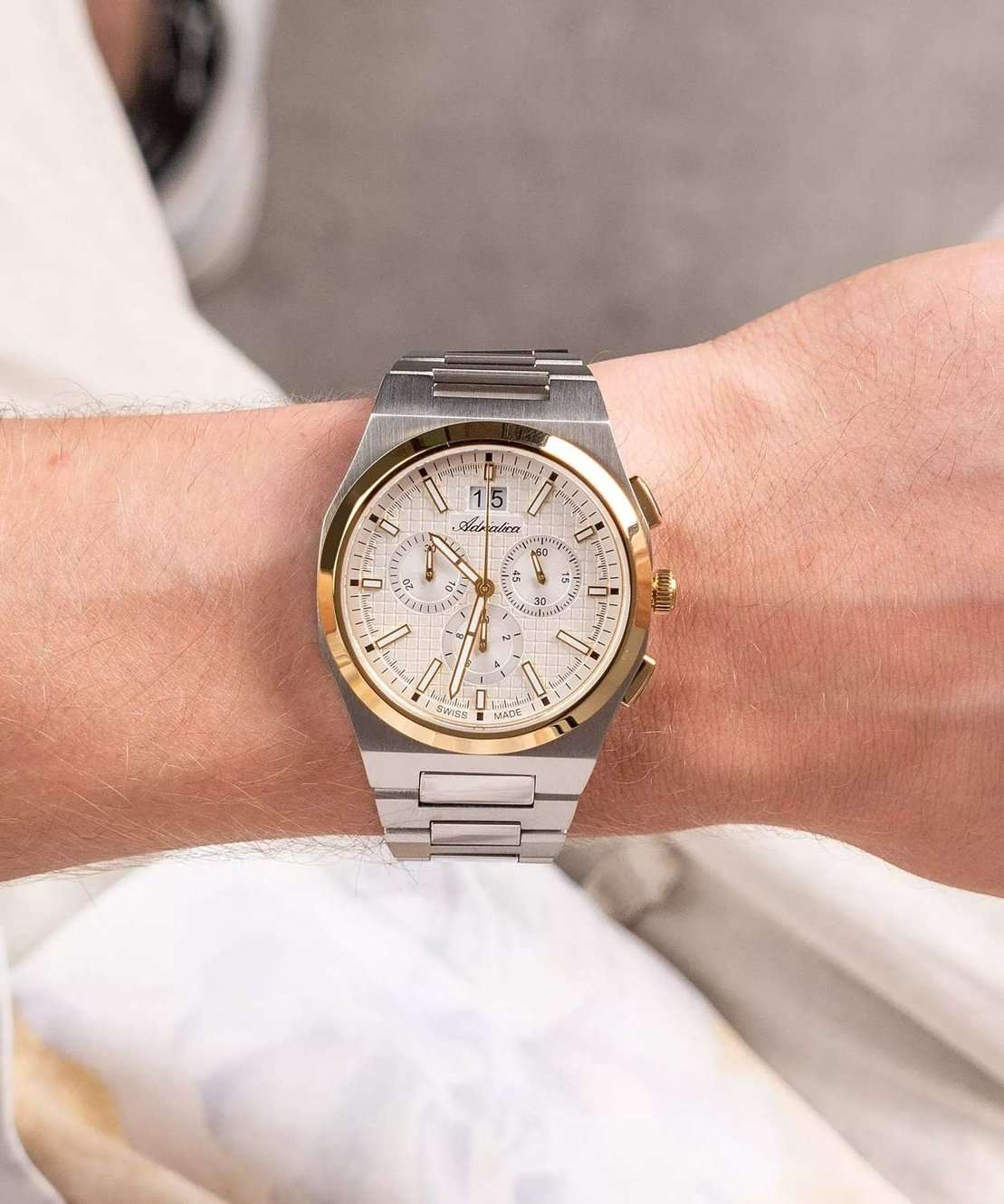 Мужские швейцарские часы-хронографХронографФункция позволяет измерять отрезки времени с особой точностью: часы, минуты, секунды. Верным признаком хронографа является наличие на циферблате 3 дополнительных окошек-счётчиков. с секундомеромСекундомерСекундоме́р — прибор, способный измерять интервалы времени с точностью до долей секунды. Adriatica Premiere A8326.2113CH воплощают в себе элегантность и функциональность, идеально подходящие для современных мужчин, ценящих швейцарское качество. Их белый циферблат защищенный сапфировым стекломСапфировое стеклоПрочный и надёжный материал из кристалла сапфира синтетического происхождения, характеризующийся особой твёрдостью и устойчивостью к царапинам и повреждениям., заключен в корпус из нержавеющей стали диаметром 40 мм и толщиной 10 мм, а на безельБезельВнешний ободок, закрепляющий стекло. В спортивных часах так называется поворотное кольцо с делениями на циферблате, выполняет роль таймера – замеряет отрезки времени на шкале. Неподвижный безель – элемент декора. Однонаправленно вращающийся безель на дайверских часах позволяет фиксировать моменты погружения и выныривания на поверхность. нанесено PVDPVDУльтратонкое покрытие наносится в технике вакуумного напыления, сочетает в себе нитрид титана особой прочности со слоем золота или оксида хрома. Несёт в себе декоративную или защитную функцию. покрытие. Надежный кварцевый механизм с калибром Ronda 5040.B обеспечивает высокую точность, а водозащита 5 ATM делает часы устойчивыми к воздействию воды. Стальной браслет с раскладной застёжкойРаскладная застёжкаТакой тип застёжки используется только на браслетах из металла. Она никогда не раскрывается полностью, происходит разделение на 2 и более частей. Раскладывающая застёжка снизит вероятность потери часов к минимуму. обеспечивает комфортное и надежное ношение. Фактурный циферблат с метками в виде штрихов дополнен рисунком в клетку, а окошко даты находится в положении 12 часов, что добавляет практичности в повседневной жизни. Люминесцентное покрытиеЛюминесцентное покрытиеПозволяет считывать показания времени в темноте. Производители наносят на стрелки, часовые индексы, безель или поверхность циферблата светонакопительный состав, дающий холодное свечение. на стрелках и метках обеспечивает отличную видимость в темноте.