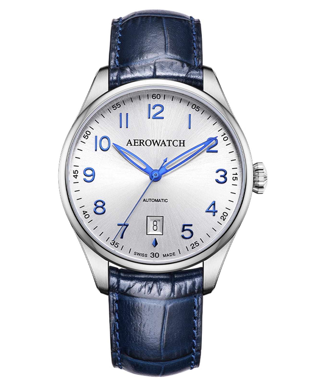 Мужские механические швейцарские часы с автоподзаводом Aerowatch Les Grandes Classiques 60996 AA01. Сапфировое стеклоСапфировое стеклоПрочный и надёжный материал из кристалла сапфира синтетического происхождения, характеризующийся особой твёрдостью и устойчивостью к царапинам и повреждениям. устойчивое к появлению царапин, обладающее высокой прозрачностью. Корпус изготовлен из нержавеющей стали. В часах установлен калибр 2824-2 ETA с 25 камнями, ротором. Серебристый sunray циферблат украшен синими арабскими цифрами и скелетонизированными стрелками, окошко даты в положении 6 часов. Класс водозащиты: 50 метров, позволит защитить корпус от случайных брызг или капель дождя. Кожаный ремешок на стандартной застёжке.