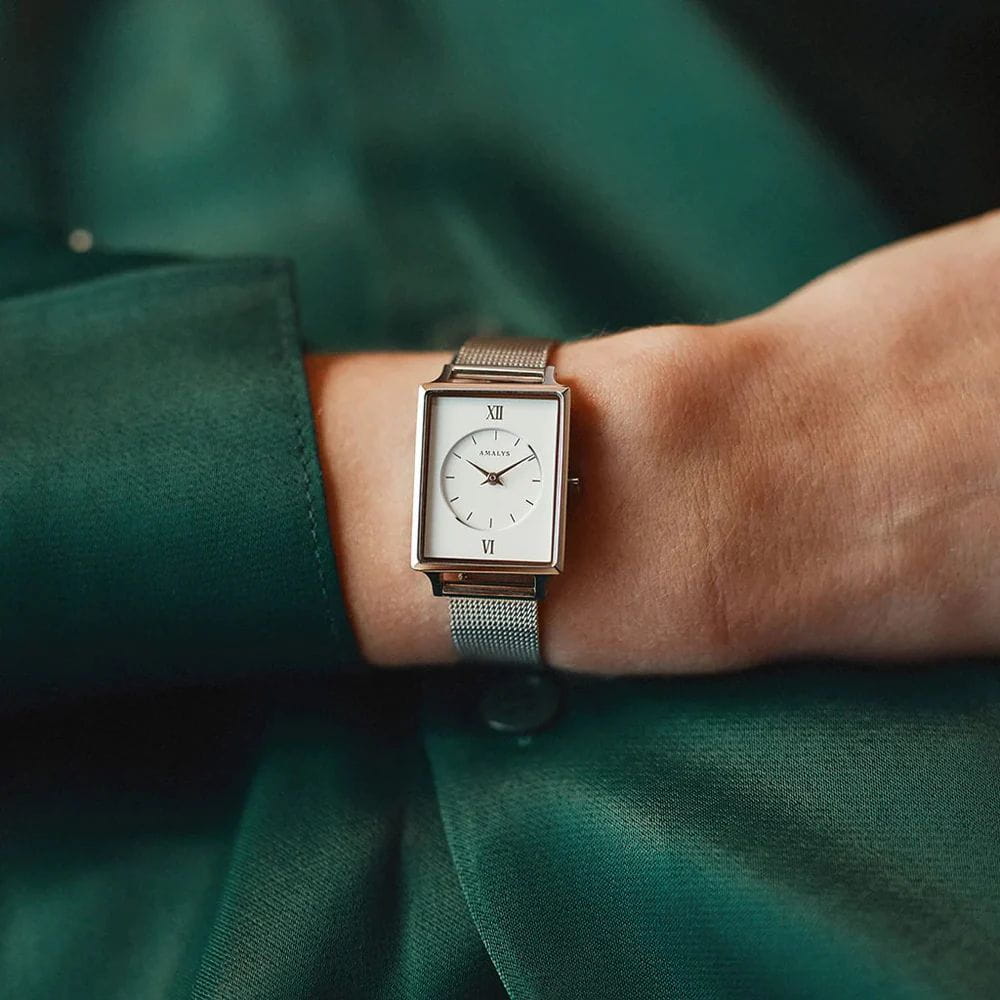 Amalys AMW-046 — женская модель с утончённой минималистичной эстетикой, где корпус размером 23 мм подчёркивает современный характер и чистоту линий. Механизм — точный кварцевый, обеспечивающий стабильный ход и надёжность в повседневном использовании. Поверхность циферблата оформлена в лаконичном стиле с тонкими метками и стрелками, создающими гармонию и визуальную лёгкость. Защитную функцию выполняет минеральное стеклоМинеральное стеклоМинеральное стекло представляет собой искусственно выращенный минерал кварца. Такое стекло отличается особой устойчивостью к повреждениям и царапинам. Уступает по некоторым качествам сапфировому стеклу., устойчивое к механическим воздействиям и сохраняющее читаемость при ежедневной носке. Браслет выполнен в виде «миланской сетки» шириной 14 мм, оснащён раскладным замкомРаскладной замокДанный вариант застежки используется только на часах с металлическим браслетом. Отличительная особенность такого крепления в том, что длина браслета становится универсальной и вы можете самостоятельно отрегулировать нужный вам размер – застежка просто двигается по браслету часов., его гибкая структура обеспечивает комфортное прилегание к запястью и визуальную утончённость. Единство корпуса и браслета создаёт целостный образ, а изысканная простота дизайна делает модель универсальной — она одинаково уместна и в деловой обстановке, и в повседневных сочетаниях.