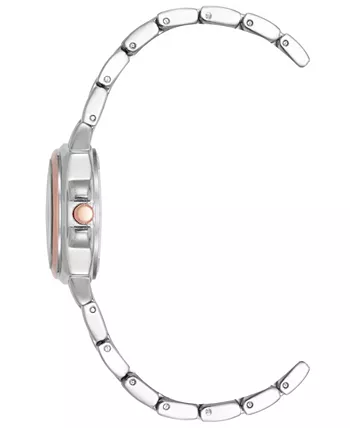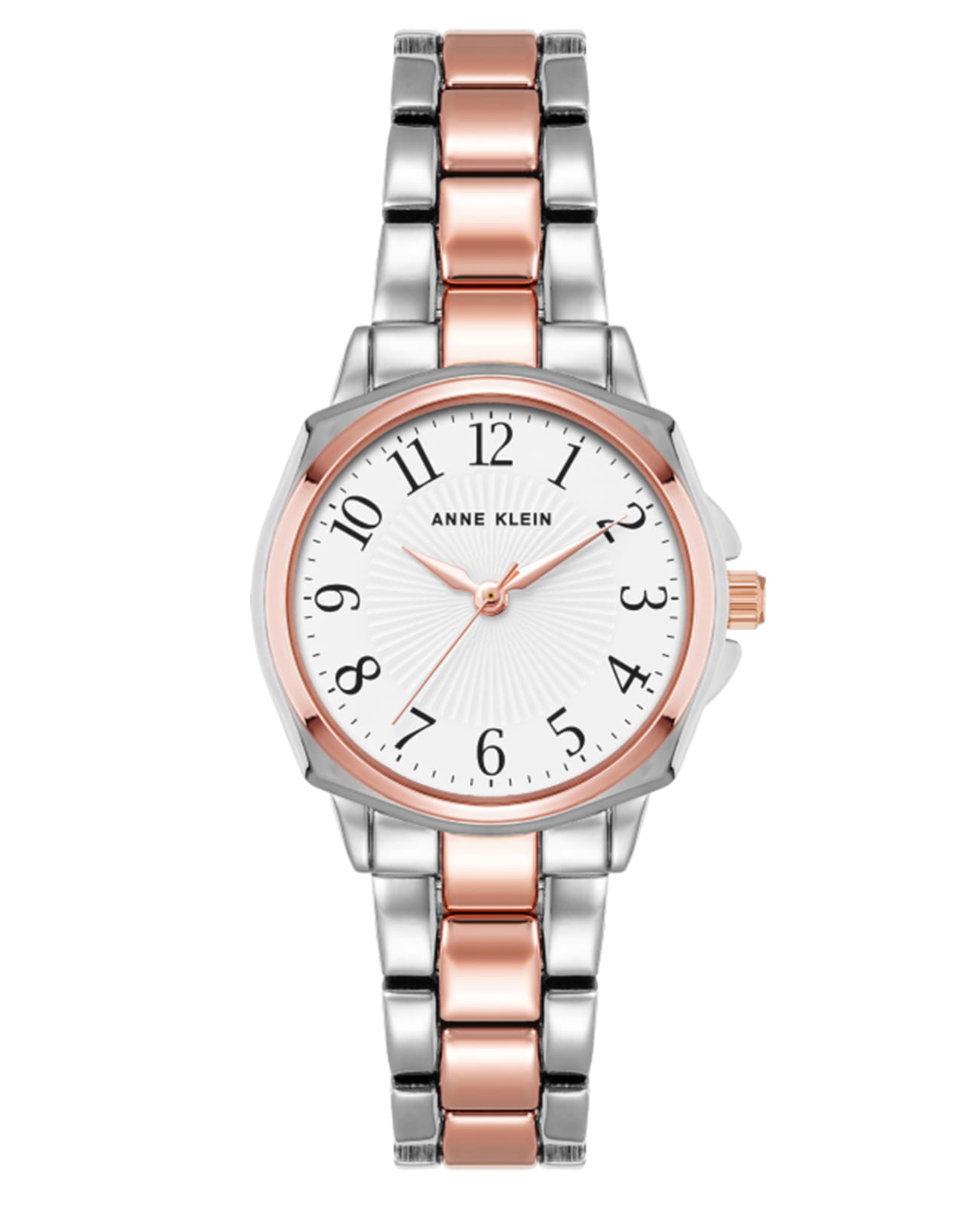 Женские американские часы с минеральным стекломМинеральное стеклоМинеральное стекло представляет собой искусственно выращенный минерал кварца. Такое стекло отличается особой устойчивостью к повреждениям и царапинам. Уступает по некоторым качествам сапфировому стеклу. Anne Klein Metals 4167WTRT, кварцевый механизм с высокой точностью. Класс водозащиты: 30 метров, позволит защитить корпус от случайных брызг или капель дождя. Корпус часов изготовлен из стали с безелемБезельВнешний ободок, закрепляющий стекло. В спортивных часах так называется поворотное кольцо с делениями на циферблате, выполняет роль таймера – замеряет отрезки времени на шкале. Неподвижный безель – элемент декора. Однонаправленно вращающийся безель на дайверских часах позволяет фиксировать моменты погружения и выныривания на поверхность. с IP-покрытиемIP-покрытиеМетод ионного напыления. Демонстрирует повышенную устойчивость к истиранию, окислению и химическим веществам. Под воздействием высокого давления и температуры около 1500°C молекулы металла надёжно соединяются с частицами корпуса часов.. Стальной браслет на раскладной застёжкеРаскладная застёжкаТакой тип застёжки используется только на браслетах из металла. Она никогда не раскрывается полностью, происходит разделение на 2 и более частей. Раскладывающая застёжка снизит вероятность потери часов к минимуму. с частичным IP-покрытиемIP-покрытиеМетод ионного напыления. Демонстрирует повышенную устойчивость к истиранию, окислению и химическим веществам. Под воздействием высокого давления и температуры около 1500°C молекулы металла надёжно соединяются с частицами корпуса часов..
