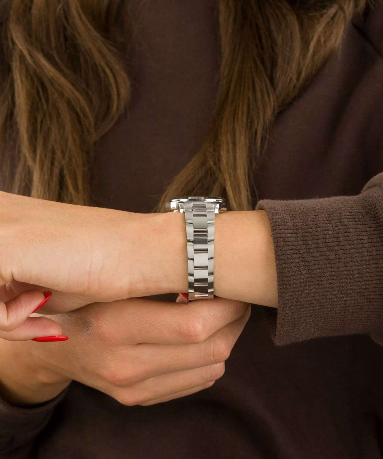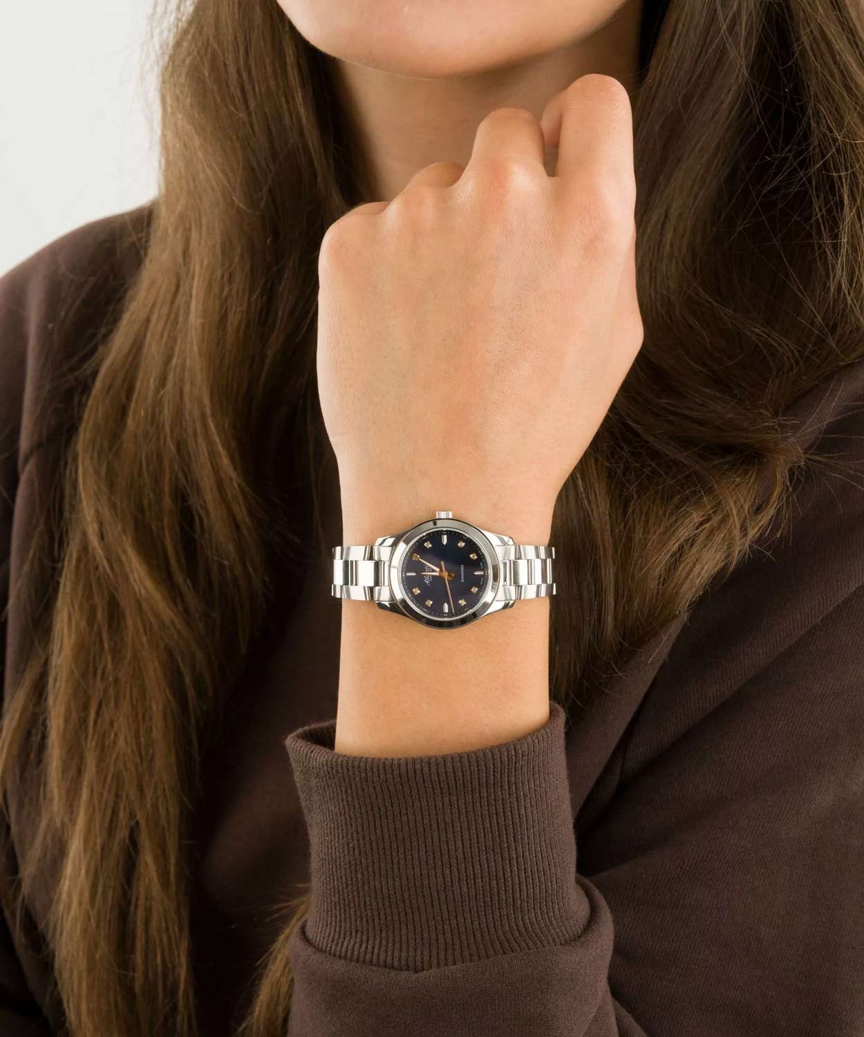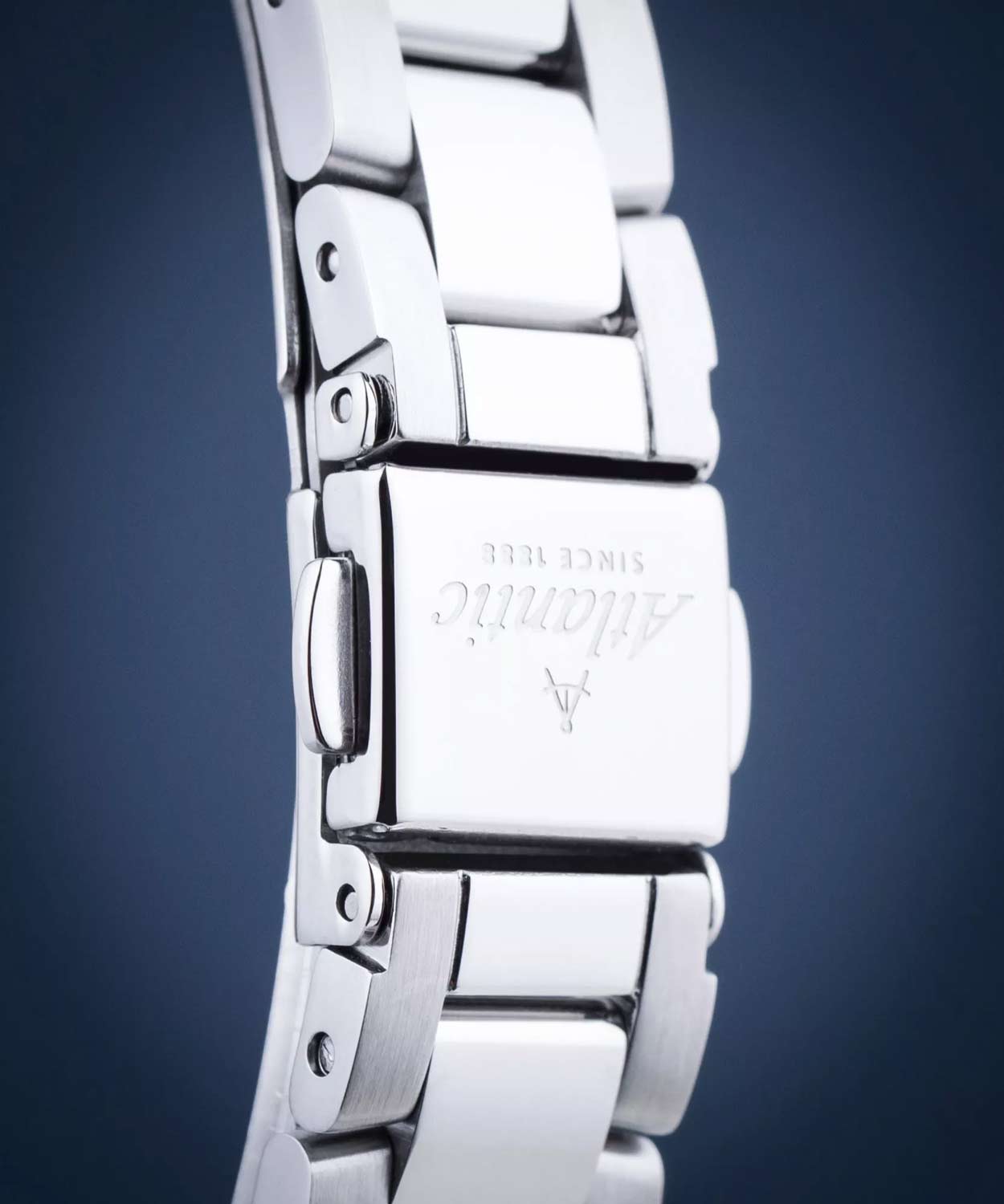 Женские швейцарские часы Atlantic Seapair Ladies 20335.41.57G, кварцевый механизм с высокой точностью. Циферблат часов с люминесцентным покрытиемЛюминесцентное покрытиеПозволяет считывать показания времени в темноте. Производители наносят на стрелки, часовые индексы, безель или поверхность циферблата светонакопительный состав, дающий холодное свечение. стрелок и меток, дополнен сапфировым стекломСапфировое стеклоПрочный и надёжный материал из кристалла сапфира синтетического происхождения, характеризующийся особой твёрдостью и устойчивостью к царапинам и повреждениям., устойчивым к появлению царапин и обладающее высокой прозрачностью. Класс водозащиты: 30 метров, позволит защитить корпус от случайных брызг или капель дождя. Корпус часов изготовлен из нержавеющей стали. Стальной браслет с раскладной застёжкойРаскладная застёжкаТакой тип застёжки используется только на браслетах из металла. Она никогда не раскрывается полностью, происходит разделение на 2 и более частей. Раскладывающая застёжка снизит вероятность потери часов к минимуму.. Циферблат с метками в виде штрихов и точек, инкрустированных кристаллами.