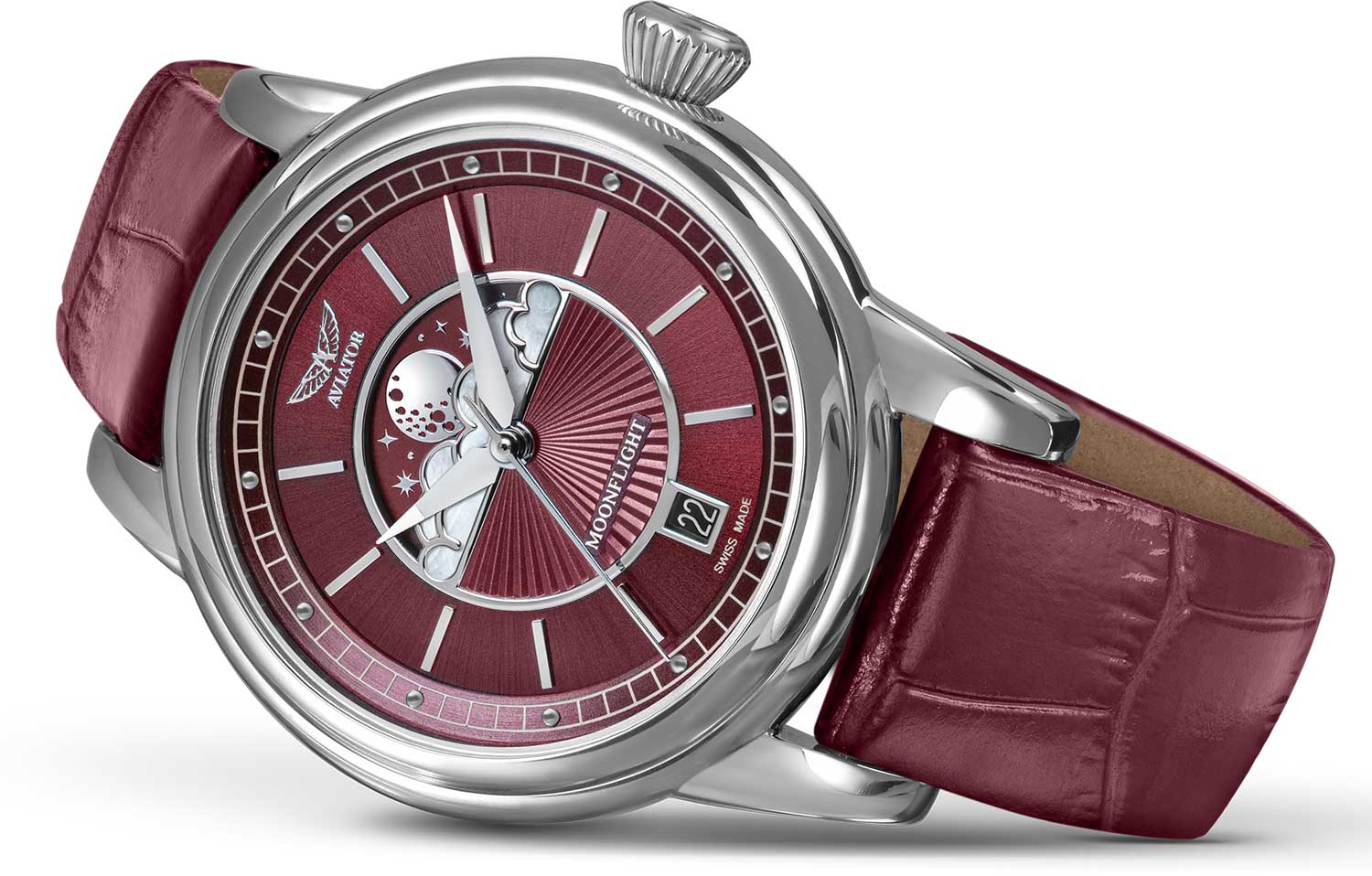 Aviator V.1.33.0.264.4 “Douglas Moonflight” — элегантный дамский швейцарский Moonphase с утончённой авиационной эстетикой. Корпус 36 мм из нержавеющей стали с полированной отделкой обладает компактными пропорциями и удобным литым профилем.