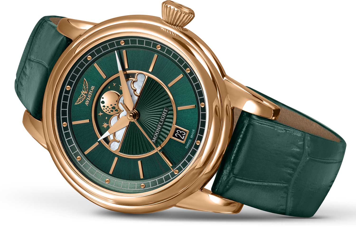Aviator V.1.33.2.263.4 “Douglas Moonflight” — элегантный дамский швейцарский Moonphase-хронограф с утончённой авиационной эстетикой. Корпус 36 мм из нержавеющей стали с PVD-покрытиемPVDУльтратонкое покрытие наносится в технике вакуумного напыления, сочетает в себе нитрид титана особой прочности со слоем золота или оксида хрома. Несёт в себе декоративную или защитную функцию. с полированной отделкой обладает компактными пропорциями и удобным литым профилем.