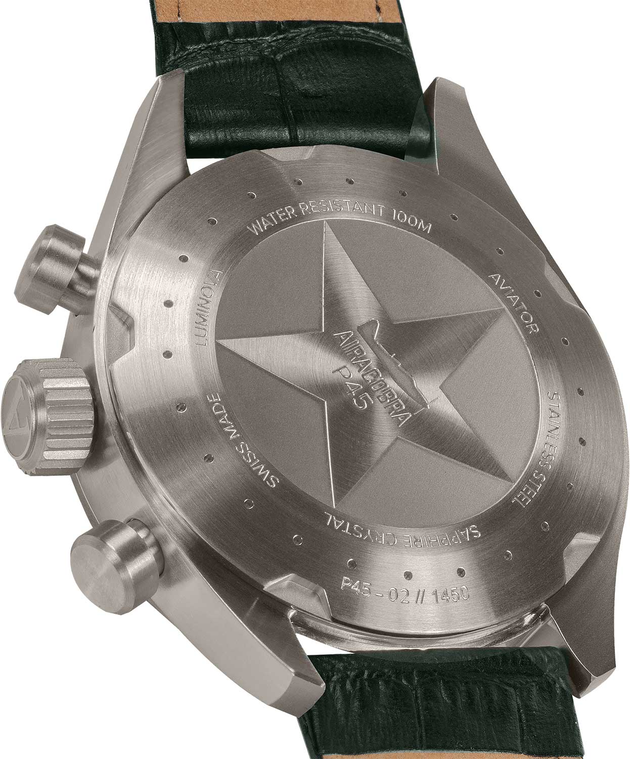 Aviator Airacobra V.2.25.7.171.4 — швейцарский GMT-хронограф в духе пилотских инструментов, объединяющий точность, удобство и лаконичный дизайн. Диаметр корпуса — 45 мм, выполнен из нержавеющей стали, что подчёркивает техническую надёжность в образе часов.