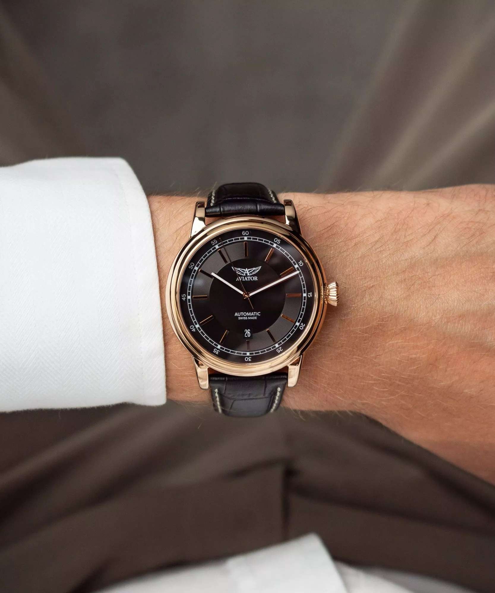 Aviator Douglas DC-3 V.3.32.2.242.4 — швейцарские часы в классике авиадизайна, сочетающие безупречную читаемость и высокую надёжность. Лимитированная серия. Корпус диаметром 45 мм выполнен из нержавеющей стали 316L с PVD-покрытиемPVDУльтратонкое покрытие наносится в технике вакуумного напыления, сочетает в себе нитрид титана особой прочности со слоем золота или оксида хрома. Несёт в себе декоративную или защитную функцию. цвета розового золота. Накладные метки выполнены в виде штрихов. Окошко даты находится в положении 6 часов. Часовые метки и стрелки покрыты люминесцентным покрытиемЛюминесцентное покрытиеПозволяет считывать показания времени в темноте. Производители наносят на стрелки, часовые индексы, безель или поверхность циферблата светонакопительный состав, дающий холодное свечение. Superluminova, позволяющим легко определять время даже в тёмное время суток. Поверхность защищена прочным сапфировым стекломСапфировое стеклоПрочный и надёжный материал из кристалла сапфира синтетического происхождения, характеризующийся особой твёрдостью и устойчивостью к царапинам и повреждениям. с антибликовым покрытием, устойчивым к царапинам. Сердце модели — швейцарский механизм Sellita SW 200, известный своей точностью и долговечностью. Водозащита 100 метров, позволит плавать, нырять и заниматься другими водными видами спорта. Завинчивающаяся головка и задняя крышка обеспечивают уверенную ударопрочностьУдаропрочный корпусМеханизм заключён в корпус, выполненный из современных материалов, устойчивых к ударам, механическим повреждениям и падению с высоты: инновационный пластик, карбон, нержавеющая сталь, титан. и надёжную защиту от влаги и пыли. В механизме 26 камней, запас хода 38 часов. Модель дополнена кожаным ремешком с выразительной текстурой и классическим стилем, закреплённым с помощью застёжке-бабочке с кнопкамиЗастёжка "бабочка"Такой вид застёжки дополняется предохранителями, помогающими избежать случайного раскрытия браслета. Обладают изящным исполнением. — для максимального комфорта и лёгкости в повседневном использовании. Циферблат выполнен по технологии sun-ray (солнечные лучи). Коллекция Douglas была разработана в честь известного американского пассажирского самолета Douglas DC-3. Aviator — это образец лётной точности, инженерной чёткости и сдержанной роскоши, идеально подходящий для тех, кто ценит функциональность и уверенность в каждом элементе.