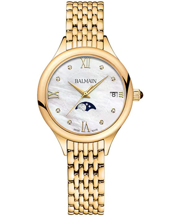 Женские часы Balmain de Balmain B4910.33.85 кварцевый механизм с высокой точностью. Сапфировое стеклоСапфировое стеклоПрочный и надёжный материал из кристалла сапфира синтетического происхождения, характеризующийся особой твёрдостью и устойчивостью к царапинам и повреждениям. устойчивое к появлению царапин, обладающее высокой прозрачностью. Корпус изготовлен из нержавеющей стали PVD-покрытиемPVDУльтратонкое покрытие наносится в технике вакуумного напыления, сочетает в себе нитрид титана особой прочности со слоем золота или оксида хрома. Несёт в себе декоративную или защитную функцию.. Класс водозащиты: 50 метров, позволит защитить корпус от случайных брызг или капель дождя. Стальной браслет с PVD-покрытиемPVDУльтратонкое покрытие наносится в технике вакуумного напыления, сочетает в себе нитрид титана особой прочности со слоем золота или оксида хрома. Несёт в себе декоративную или защитную функцию.. на застёжке «бабочка» с кнопкамиЗастёжка "бабочка"Такой вид застёжки дополняется предохранителями, помогающими избежать случайного раскрытия браслета. Обладают изящным исполнением. . БезельБезельВнешний ободок, закрепляющий стекло. В спортивных часах так называется поворотное кольцо с делениями на циферблате, выполняет роль таймера – замеряет отрезки времени на шкале. Неподвижный безель – элемент декора. Однонаправленно вращающийся безель на дайверских часах позволяет фиксировать моменты погружения и выныривания на поверхность. с PVD-покрытиемPVDУльтратонкое покрытие наносится в технике вакуумного напыления, сочетает в себе нитрид титана особой прочности со слоем золота или оксида хрома. Несёт в себе декоративную или защитную функцию.. Лунный календарь в позиции 6 часов.