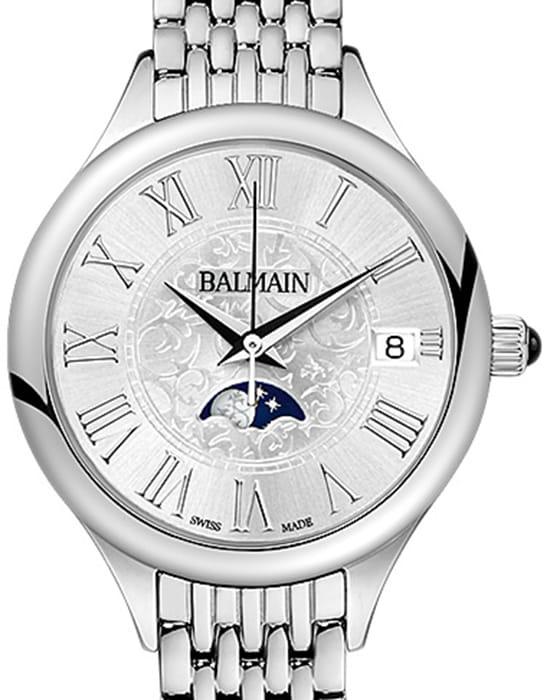 Женские часы Balmain de Balmain B4911.33.12 кварцевый механизм с высокой точностью. Сапфировое стеклоСапфировое стеклоПрочный и надёжный материал из кристалла сапфира синтетического происхождения, характеризующийся особой твёрдостью и устойчивостью к царапинам и повреждениям. устойчивое к появлению царапин, обладающее высокой прозрачностью. Корпус изготовлен из нержавеющей стали. Класс водозащиты: 50 метров, позволит защитить корпус от случайных брызг или капель дождя. Стальной браслет миланского плетения на застёжке «бабочка» с кнопкамиЗастёжка "бабочка"Такой вид застёжки дополняется предохранителями, помогающими избежать случайного раскрытия браслета. Обладают изящным исполнением. . Окошко даты находится в положении 3 часов. Лунный календарь в положении 6 часов.