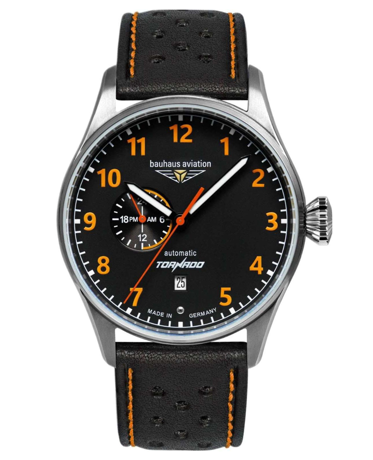 Мужские механические часы с автоподзаводом Bauhaus — это аксессуар в стиле авиационных приборов. Корпус диаметром 42 мм и толщиной 13 мм выполнен из нержавеющей стали. Циферблат чёрного цвета оформлен арабскими цифрами и прямоугольными стрелками. Окошко даты расположено в положении 6 часов, также присутствует дополнительный 24-часовой циферблат. Стрелки и метки с люминесцентным покрытиемЛюминесцентное покрытиеПозволяет считывать показания времени в темноте. Производители наносят на стрелки, часовые индексы, безель или поверхность циферблата светонакопительный состав, дающий холодное свечение., обеспечивающим хорошую читаемость в темноте. Циферблат защищён прочным минеральным стекломМинеральное стеклоМинеральное стекло представляет собой искусственно выращенный минерал кварца. Такое стекло отличается особой устойчивостью к повреждениям и царапинам. Уступает по некоторым качествам сапфировому стеклу. K1. Механизм — автоматический калибр Miyota 8217. Прозрачная задняя крышка позволяет наблюдать за работой механизма. Часы оснащены чёрным кожаным ремешком на классической пряжке. Водонепроницаемость 50 м позволяет использовать часы в повседневных условиях. Идеальный выбор для тех, кто ценит немецкое качество и функциональный дизайн.