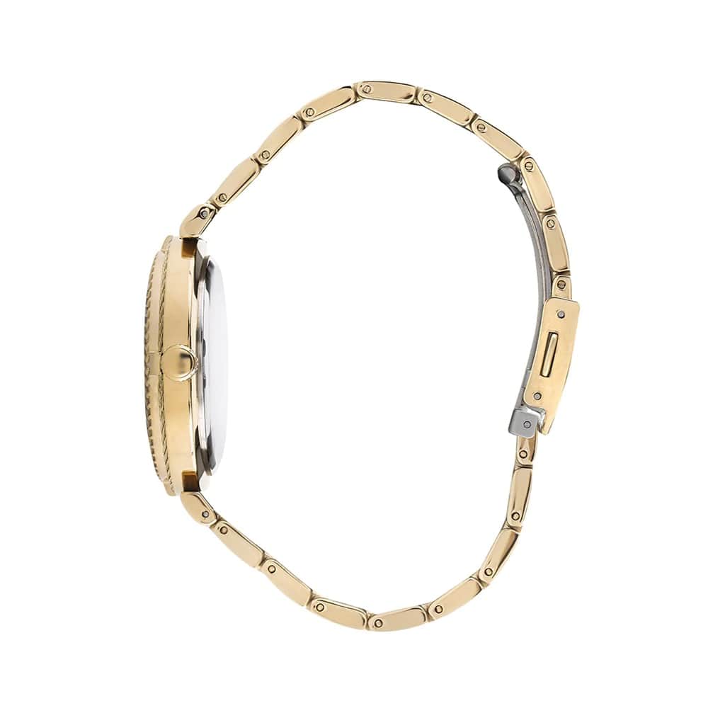 Водозащита до 3 ATM (30 метров) защищает часы от брызг и дождя, но не подходит для плавания. Металлический браслет золотого цвета с классической застёжкой обеспечивает комфортное ношение и надёжную фиксацию.