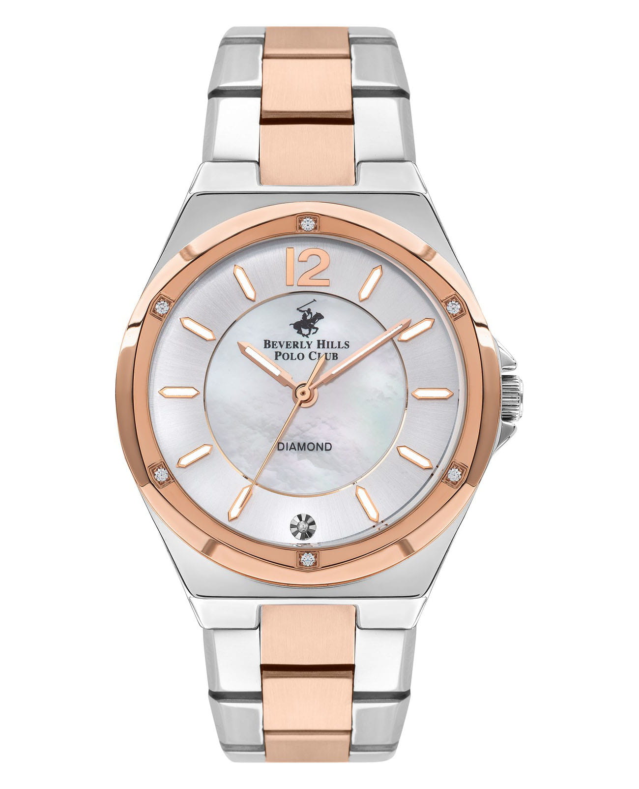 Американские женские часы с минеральным стекломМинеральное стеклоМинеральное стекло представляет собой искусственно выращенный минерал кварца. Такое стекло отличается особой устойчивостью к повреждениям и царапинам. Уступает по некоторым качествам сапфировому стеклу. Beverly Hills Polo Club BP3351X.520, кварцевый механизм с высокой точностью. Класс водозащиты: 30 метров, позволит защитить корпус от случайных брызг или капель дождя. Корпус часов изготовлен из стали, безель с IP-покрытиемIP-покрытиеМетод ионного напыления. Демонстрирует повышенную устойчивость к истиранию, окислению и химическим веществам. Под воздействием высокого давления и температуры около 1500°C молекулы металла надёжно соединяются с частицами корпуса часов.. БезельБезельВнешний ободок, закрепляющий стекло. В спортивных часах так называется поворотное кольцо с делениями на циферблате, выполняет роль таймера – замеряет отрезки времени на шкале. Неподвижный безель – элемент декора. Однонаправленно вращающийся безель на дайверских часах позволяет фиксировать моменты погружения и выныривания на поверхность. инкрустирован кристаллами. Стрелки и метки с люминесцентным покрытиемЛюминесцентное покрытиеПозволяет считывать показания времени в темноте. Производители наносят на стрелки, часовые индексы, безель или поверхность циферблата светонакопительный состав, дающий холодное свечение.. Браслет с раскладной застёжкойРаскладная застёжкаТакой тип застёжки используется только на браслетах из металла. Она никогда не раскрывается полностью, происходит разделение на 2 и более частей. Раскладывающая застёжка снизит вероятность потери часов к минимуму..