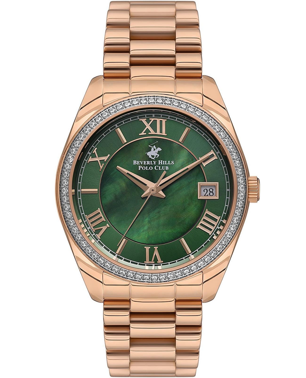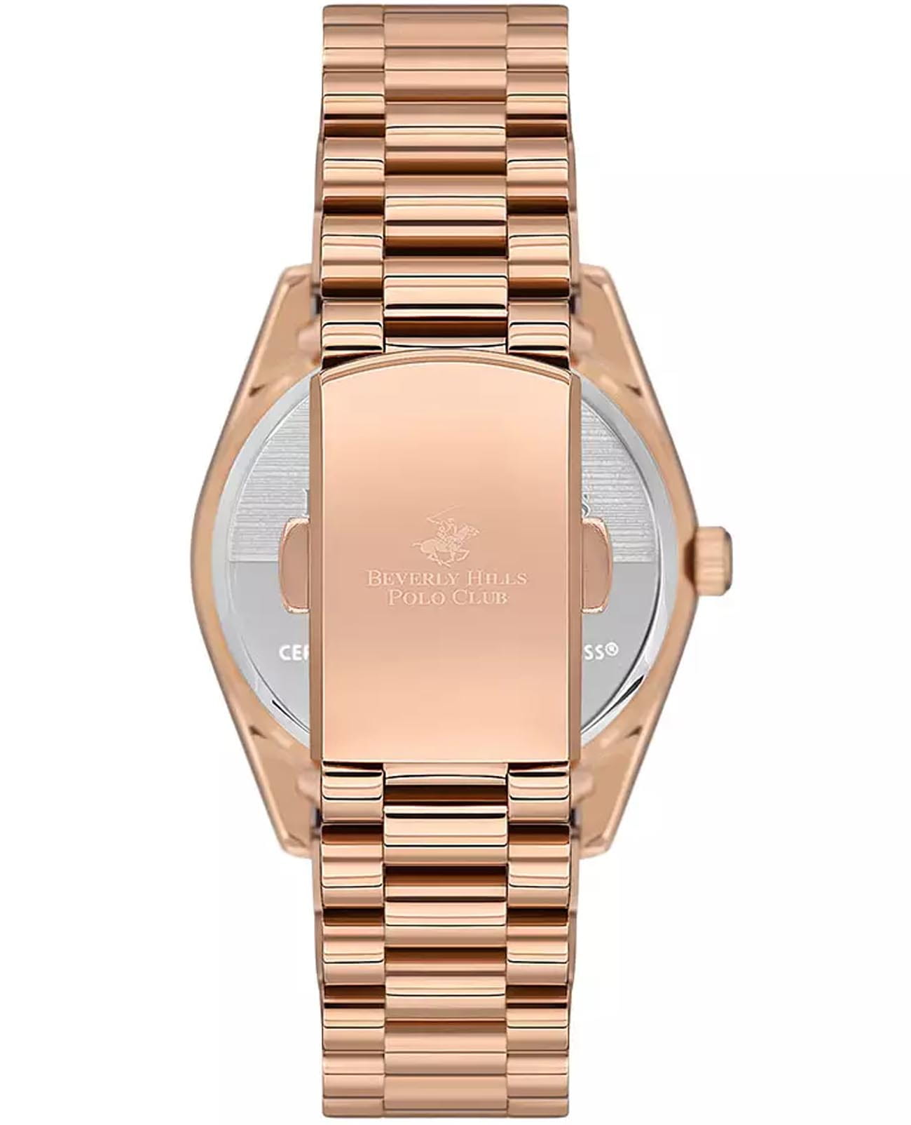 Женские часы Beverly Hills Polo BP3592C.470 с надёжным кварцевым механизмом. Минеральное стеклоМинеральное стеклоМинеральное стекло представляет собой искусственно выращенный минерал кварца. Такое стекло отличается особой устойчивостью к повреждениям и царапинам. Уступает по некоторым качествам сапфировому стеклу. устойчивое к появлению царапин, обладающее высокой прозрачностью. Класс водозащиты: 30 метров, позволит защитить корпус от случайных брызг или капель дождя. Корпус часов изготовлен из суперметалла с IP-покрытиемIP-покрытиеМетод ионного напыления. Демонстрирует повышенную устойчивость к истиранию, окислению и химическим веществам. Под воздействием высокого давления и температуры около 1500°C молекулы металла надёжно соединяются с частицами корпуса часов.. Стальной браслет на раскладной застёжкеРаскладная застёжкаТакой тип застёжки используется только на браслетах из металла. Она никогда не раскрывается полностью, происходит разделение на 2 и более частей. Раскладывающая застёжка снизит вероятность потери часов к минимуму.. БезельБезельВнешний ободок, закрепляющий стекло. В спортивных часах так называется поворотное кольцо с делениями на циферблате, выполняет роль таймера – замеряет отрезки времени на шкале. Неподвижный безель – элемент декора. Однонаправленно вращающийся безель на дайверских часах позволяет фиксировать моменты погружения и выныривания на поверхность. инкрустирован кристаллами. Окошко даты находится в положении 3 часа.