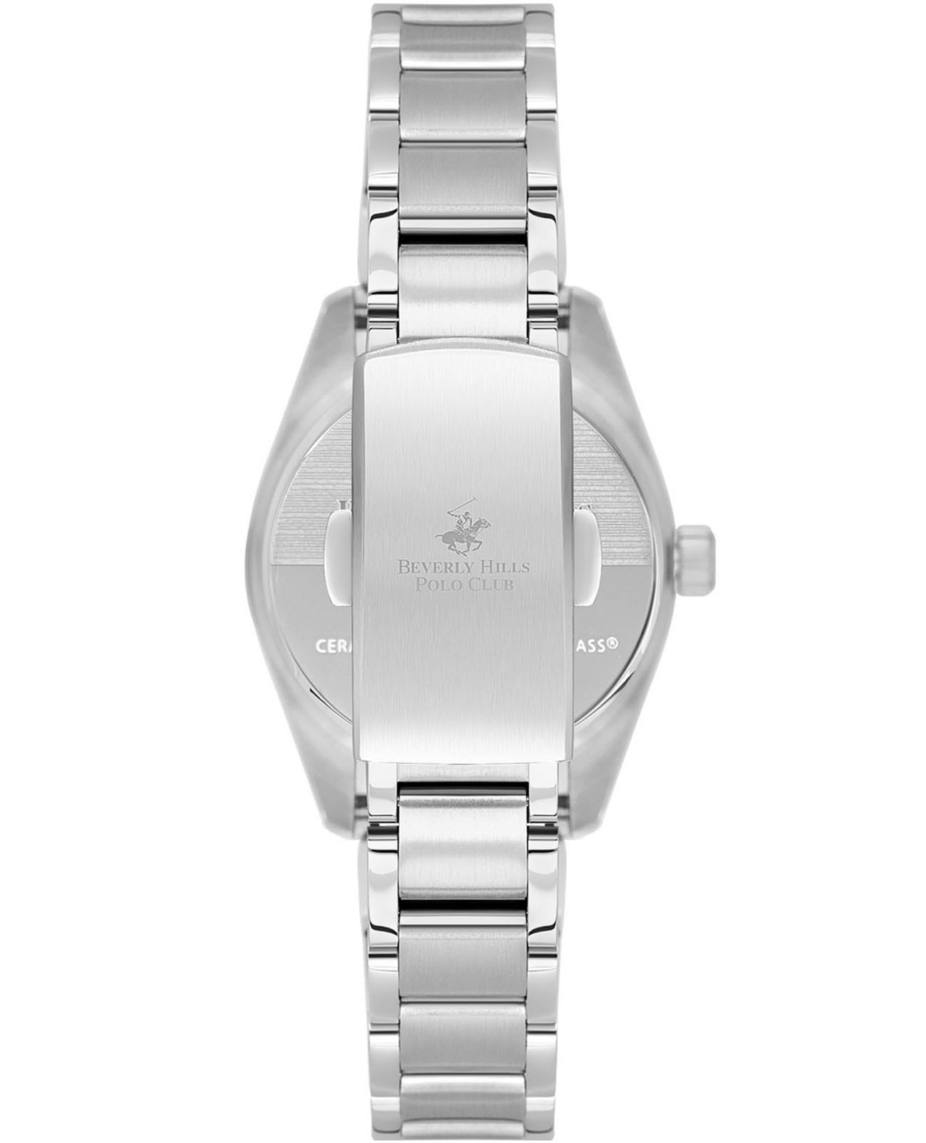Женские часы Beverly Hills Polo BP3597X.301 с надёжным кварцевым механизмом. Минеральное стеклоМинеральное стеклоМинеральное стекло представляет собой искусственно выращенный минерал кварца. Такое стекло отличается особой устойчивостью к повреждениям и царапинам. Уступает по некоторым качествам сапфировому стеклу. устойчивое к появлению царапин, обладающее высокой прозрачностью. Класс водозащиты: 50 метров, позволит защитить корпус от случайных брызг или капель дождя. Корпус и браслет часов изготовлены из нержавеющей стали. Стальной браслет на раскладной застёжкеРаскладная застёжкаТакой тип застёжки используется только на браслетах из металла. Она никогда не раскрывается полностью, происходит разделение на 2 и более частей. Раскладывающая застёжка снизит вероятность потери часов к минимуму.. Окошко дня недели находится в положении 3 часа. Стрелки и метки с люминесцентным покрытиемЛюминесцентное покрытиеПозволяет считывать показания времени в темноте. Производители наносят на стрелки, часовые индексы, безель или поверхность циферблата светонакопительный состав, дающий холодное свечение..