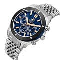 Циферблат защищен минеральным стекломМинеральное стеклоМинеральное стекло представляет собой искусственно выращенный минерал кварца. Такое стекло отличается особой устойчивостью к повреждениям и царапинам. Уступает по некоторым качествам сапфировому стеклу. с сапфировым покрытием, которое устойчиво к появлению царапин и сохраняет чистоту взгляда на протяжении длительного времени. Стрелки оснащены люминесцентным покрытиемЛюминесцентное покрытиеПозволяет считывать показания времени в темноте. Производители наносят на стрелки, часовые индексы, безель или поверхность циферблата светонакопительный состав, дающий холодное свечение., обеспечивающим отличную видимость даже при слабом освещении. БезельБезельВнешний ободок, закрепляющий стекло. В спортивных часах так называется поворотное кольцо с делениями на циферблате, выполняет роль таймера – замеряет отрезки времени на шкале. Неподвижный безель – элемент декора. Однонаправленно вращающийся безель на дайверских часах позволяет фиксировать моменты погружения и выныривания на поверхность. с IP-покрытиемIP-покрытиеМетод ионного напыления. Демонстрирует повышенную устойчивость к истиранию, окислению и химическим веществам. Под воздействием высокого давления и температуры около 1500°C молекулы металла надёжно соединяются с частицами корпуса часов..