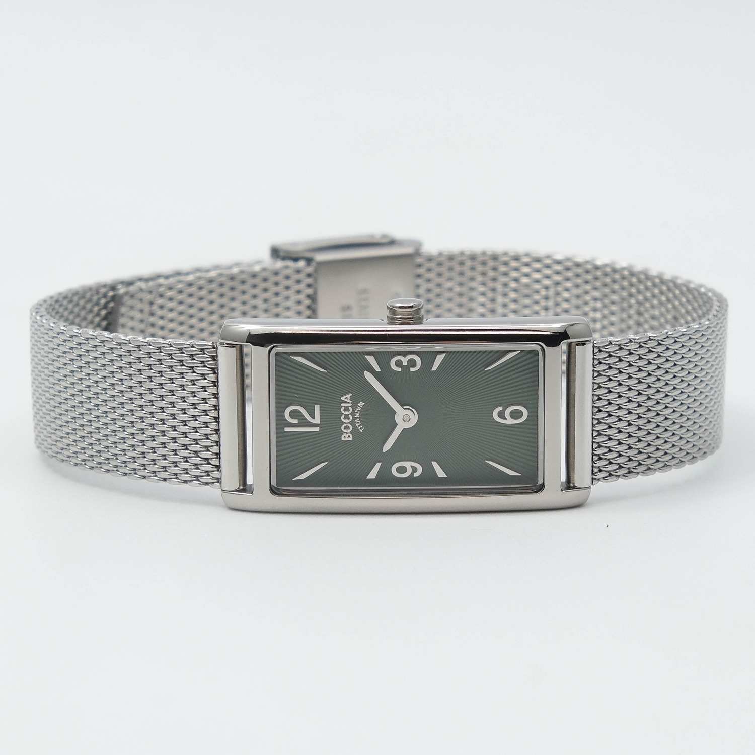 Женские часы Boccia 3366-01, которые станут стильным и функциональным аксессуаром для современной женщины. Эти часы оснащены кварцевым механизмом Miyota 5Y20, обеспечивающим точное и надежное отсчитывание времени. Центральные часовая и минутная стрелки выделяются на элегантном зеленом циферблате, создавая контрастный и выразительный образ. Прямоугольный корпус часов выполнен из суперлегкого титана, что делает их невероятно комфортными для ежедневного ношения. Размер корпуса 35х18 мм добавляет изысканности и утонченности внешнему виду. Особое внимание привлекает стальной браслет, выполненный в технике миланского плетения, который придаёт часам современный и элегантный вид. А раскладной замокРаскладной замокДанный вариант застежки используется только на часах с металлическим браслетом. Отличительная особенность такого крепления в том, что длина браслета становится универсальной и вы можете самостоятельно отрегулировать нужный вам размер – застежка просто двигается по браслету часов. обеспечивает удобство и надежность фиксации. Прочное выпуклое минеральное стеклоМинеральное стеклоМинеральное стекло представляет собой искусственно выращенный минерал кварца. Такое стекло отличается особой устойчивостью к повреждениям и царапинам. Уступает по некоторым качествам сапфировому стеклу. защищает циферблат от мелких механических повреждений, гарантируя долговечность и сохранение первоначального внешнего вида. Водостойкость уровня WR 30 обеспечивает защиту от брызг, делая их подходящими для повседневного использования.