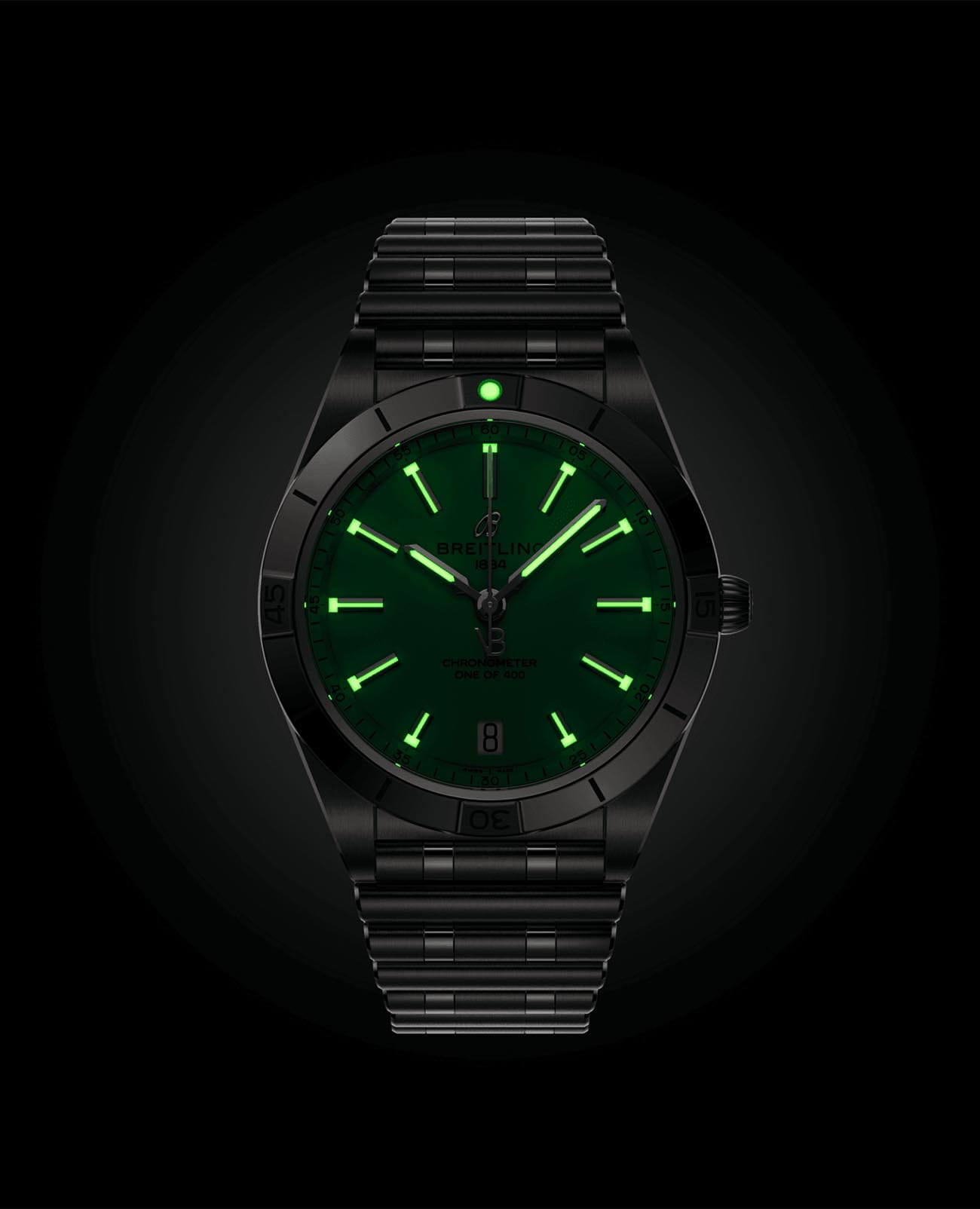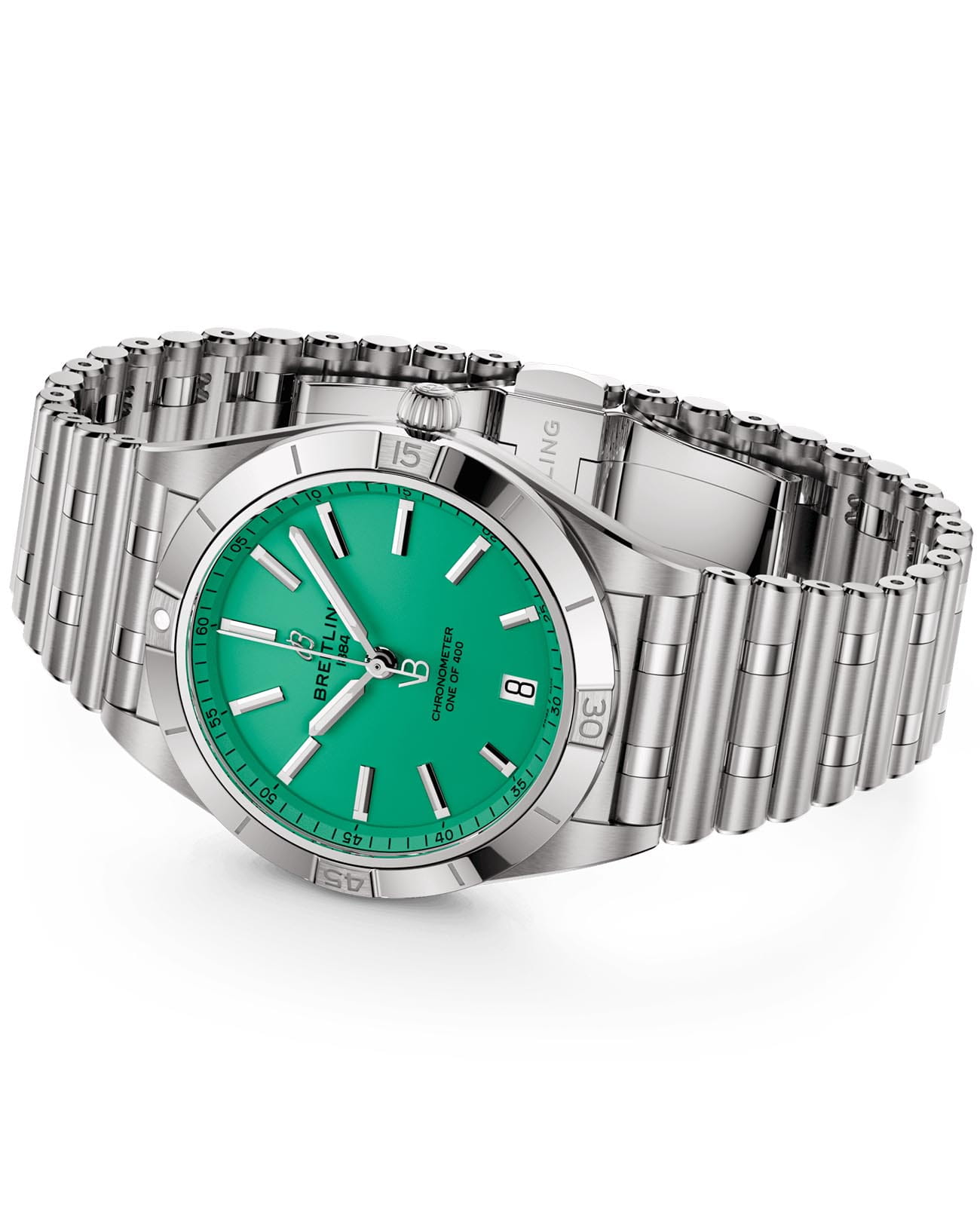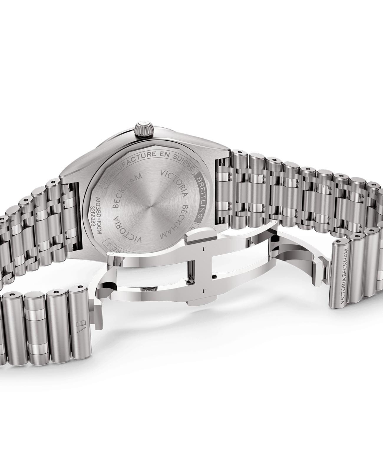 Женские швейцарские часы Breitling Chronomat Automatic 36 Victoria Beckham A103801A1L1A1 с надёжным автоматическим механизмом, выпущенные лимитированной серией всего из 1500 экземпляров в сотрудничестве с модным домом Victoria Beckham. Сапфировое стеклоСапфировое стеклоПрочный и надёжный материал из кристалла сапфира синтетического происхождения, характеризующийся особой твёрдостью и устойчивостью к царапинам и повреждениям. устойчивое к мелким механическим повреждениям. Корпус и браслет часов изготовлены из нержавеющей стали. Стальной браслет на застёжке-бабочке с кнопкамиЗастёжка "бабочка"Такой вид застёжки дополняется предохранителями, помогающими избежать случайного раскрытия браслета. Обладают изящным исполнением. . Стрелки и метки с люминесцентным покрытиемЛюминесцентное покрытиеПозволяет считывать показания времени в темноте. Производители наносят на стрелки, часовые индексы, безель или поверхность циферблата светонакопительный состав, дающий холодное свечение.. Класс водозащиты: 100 метров, позволит плавать, нырять и заниматься другими водными видами спорта. Окошко даты находится в положении 6 часов.
