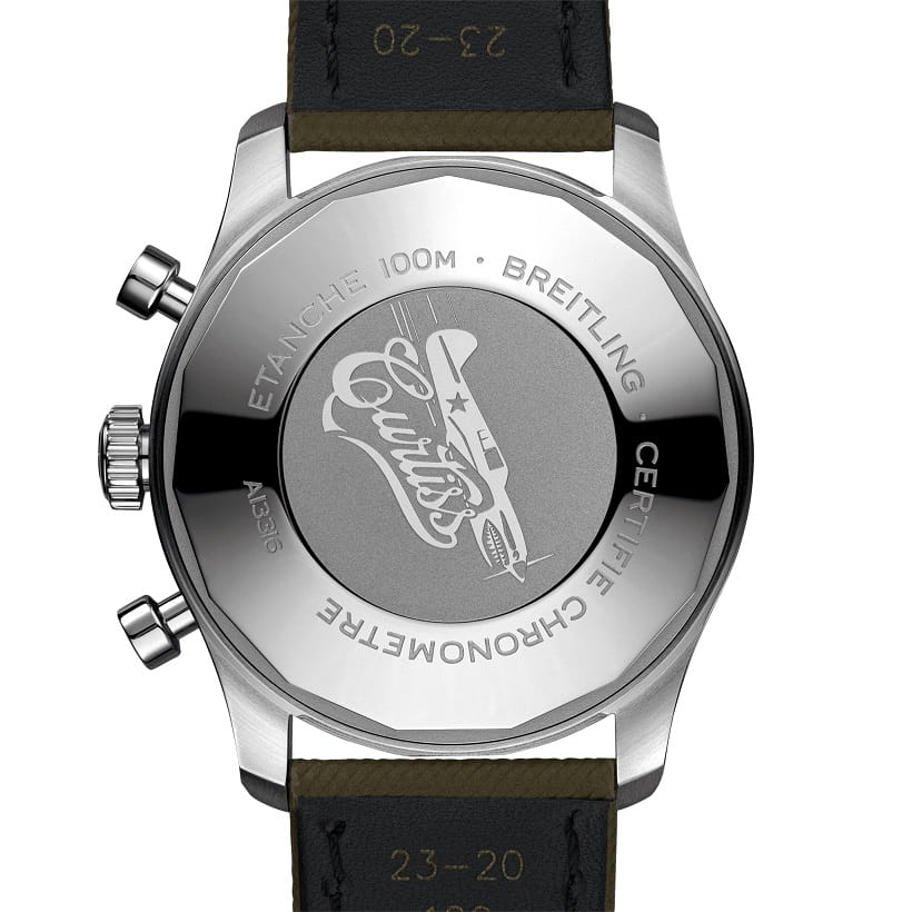 Великолепный по своим характеристикам механизм Breitling Caliber 13 гарантирует надежную работу Aviator 8 Chronograph 43 Curtiss Warhawk. Модель оснащена армейским ремешком цвета хаки, а поверхность прочной задней крышки корпуса украшают надпись Curtiss и изображение истребителя Curtiss P-40 Warhawk в виде яростной акулы с раскрытой пастью.