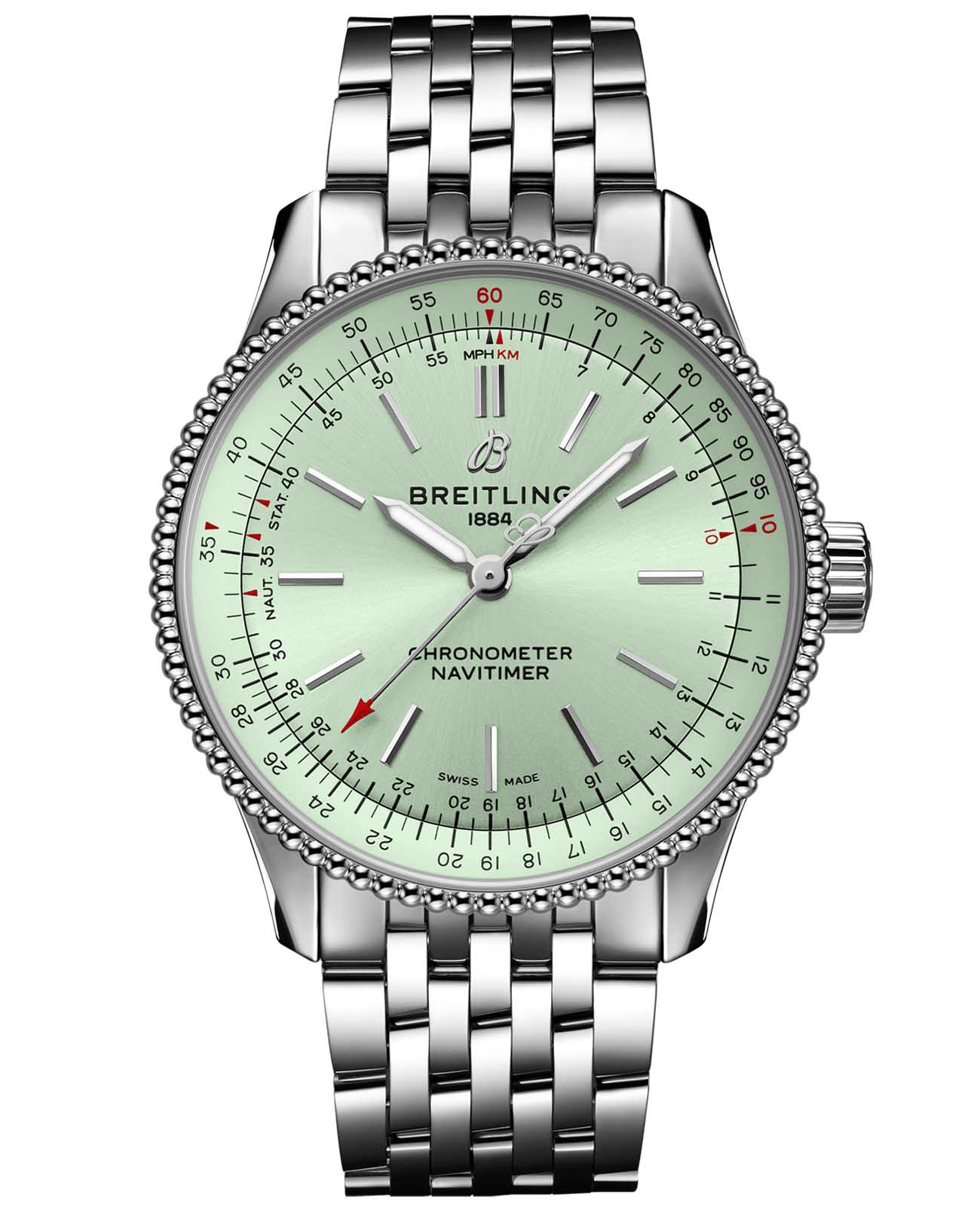 Женские швейцарские часы-хронометр Breitling Navitimer Automatic 35 A17395361L1A1, механический механизм (автоматический калибр) с высокой точностью. Сапфировое стеклоСапфировое стеклоПрочный и надёжный материал из кристалла сапфира синтетического происхождения, характеризующийся особой твёрдостью и устойчивостью к царапинам и повреждениям. устойчивое к появлению царапин, обладающее высокой прозрачностью. Класс водозащиты: 30 метров, позволит защитить корпус от случайных брызг или капель дождя. Корпус часов изготовлен из стали. Стальной браслет с застёжкой-бабочкой с кнопкамиЗастёжка "бабочка"Такой вид застёжки дополняется предохранителями, помогающими избежать случайного раскрытия браслета. Обладают изящным исполнением. . Шкала тахиметраТахиметрРазмеченная шкала, располагается на ободке или безеле часов. Тахиметр позволяет рассчитать скорость на определённом участке пути, расстояние измеряется в километрах или милях. на циферблате. Окошко даты находится в положении 6 часов. Стрелки и метки с люминесцентным покрытиемЛюминесцентное покрытиеПозволяет считывать показания времени в темноте. Производители наносят на стрелки, часовые индексы, безель или поверхность циферблата светонакопительный состав, дающий холодное свечение..