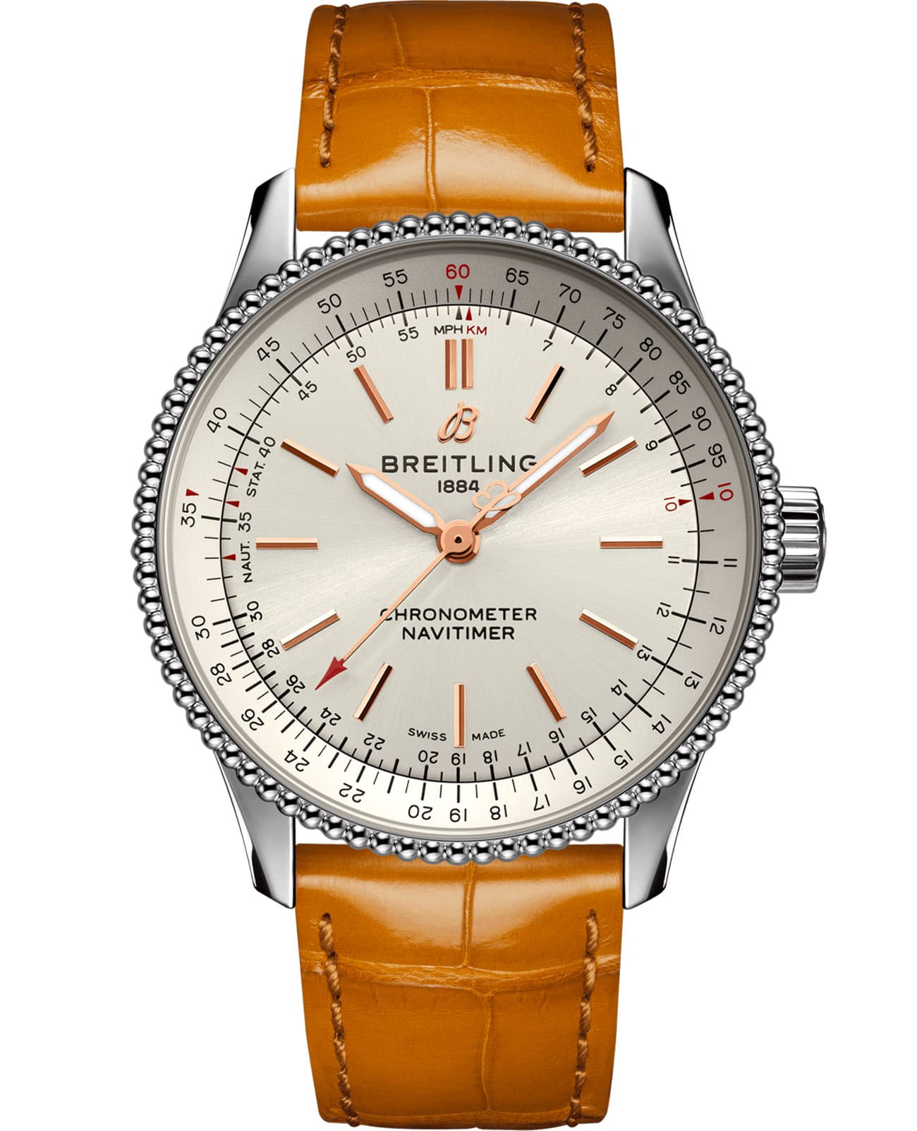 Часы Navitimer Automatic 35 предлагаются в комплекте с браслетом или блестящим синим, коричневым либо бордовым ремешком из кожи аллигатора с классической или раскладной застежкой из нержавеющей стали. Внутри корпуса спрятан мануфактурный калибр Breitling Caliber 17, сертифицированный Швейцарским институтом официального тестирования хронометров (COSC).