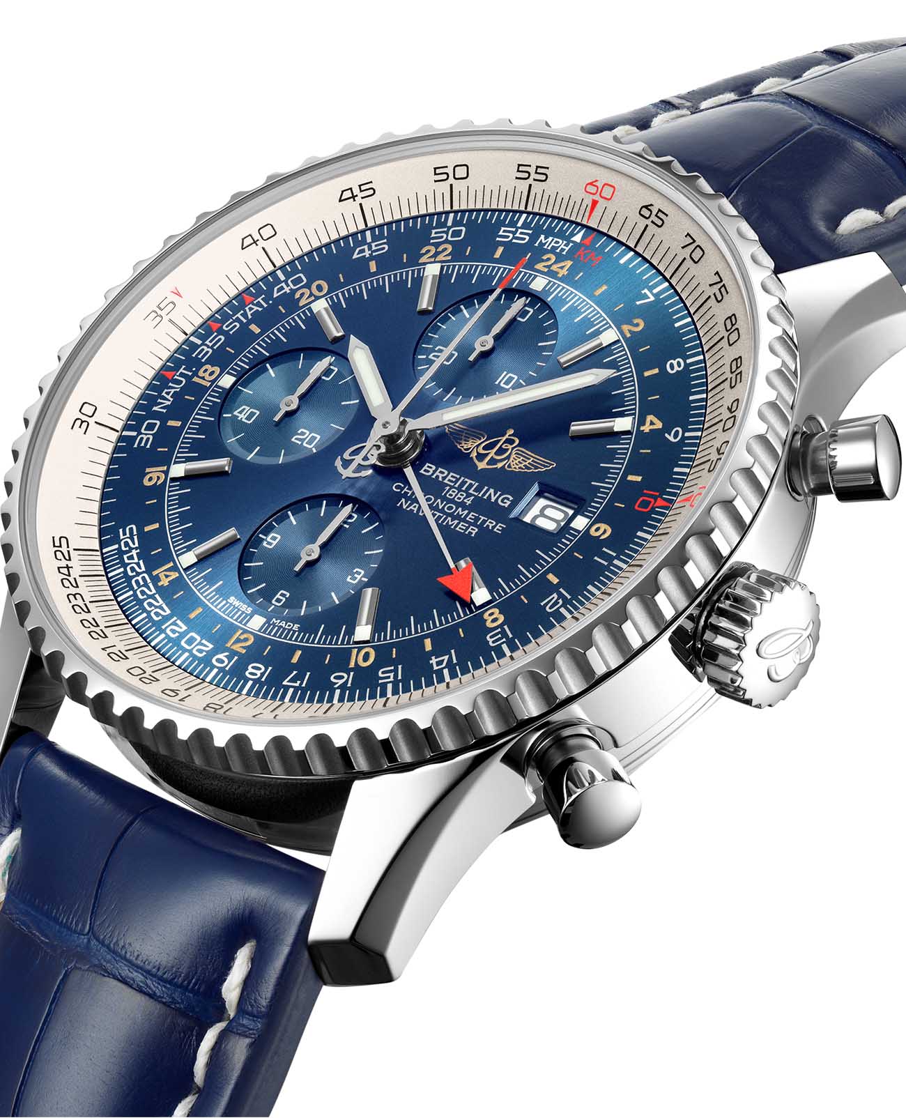 Мужские швейцарские часы-хронограф с секундомером Breitling Navitimer Chronograph GMT 46 A24322121C1P1, механический механизм (автоматический калибр) с высокой точностью. Сапфировое стеклоСапфировое стеклоПрочный и надёжный материал из кристалла сапфира синтетического происхождения, характеризующийся особой твёрдостью и устойчивостью к царапинам и повреждениям. устойчивое к появлению царапин, обладающее высокой прозрачностью. Класс водозащиты: 30 метров, позволит защитить корпус от случайных брызг или капель дождя. Корпус часов изготовлен из нержавеющей стали. Браслет из кожи аллигатора на складной клипсе. Стрелки и метки с люминесцентным покрытиемЛюминесцентное покрытиеПозволяет считывать показания времени в темноте. Производители наносят на стрелки, часовые индексы, безель или поверхность циферблата светонакопительный состав, дающий холодное свечение.. Шкала тахиметра на циферблате. Окошко даты находится в положении 3 часов. Калибр Breitling Caliber 24