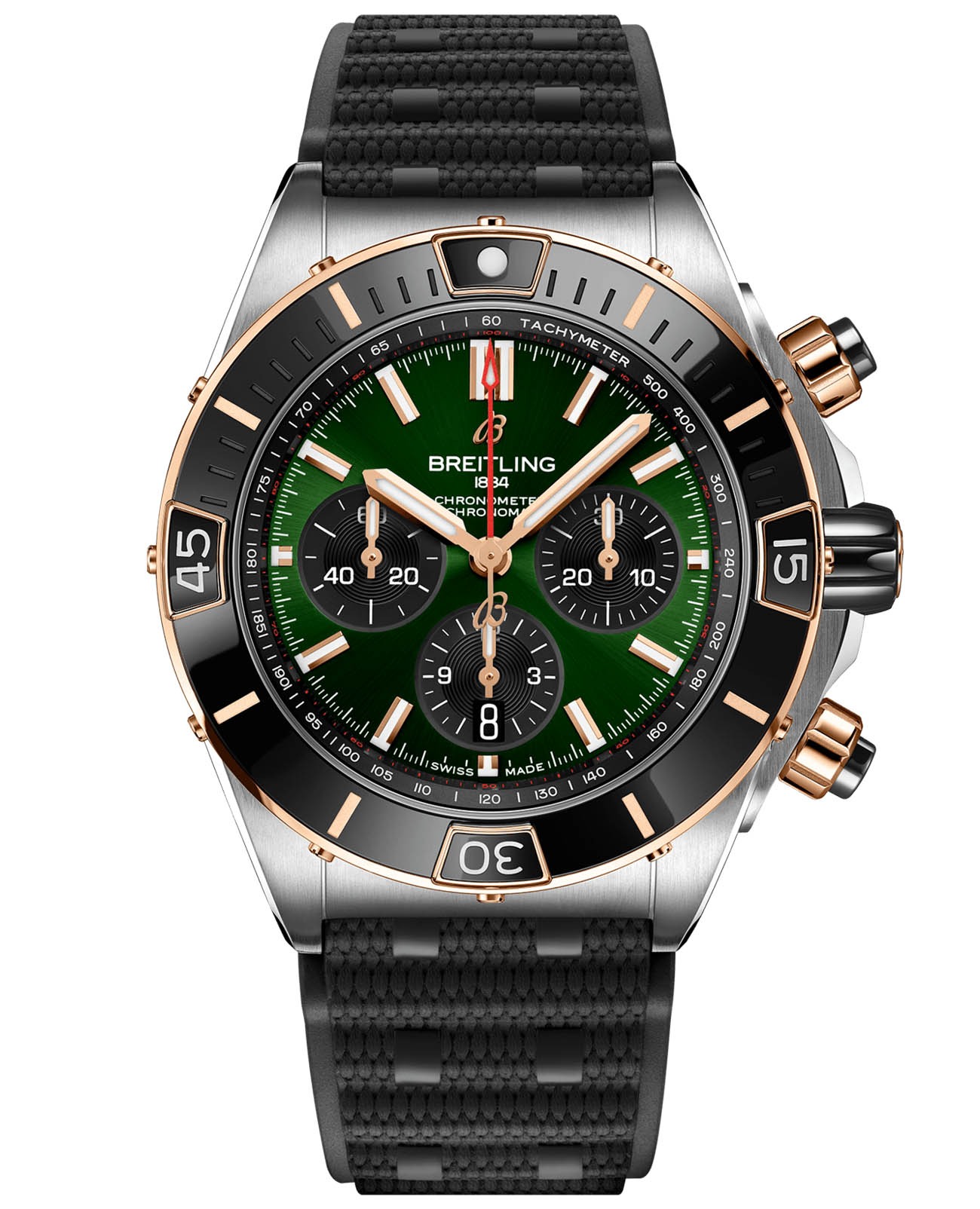 Мужские швейцарские часы-хронографХронографФункция позволяет измерять отрезки времени с особой точностью: часы, минуты, секунды. Верным признаком хронографа является наличие на циферблате 3 дополнительных окошек-счётчиков. с секундомеромСекундомерСекундоме́р — прибор, способный измерять интервалы времени с точностью до долей секунды. Breitling Super Chronomat B01 44 UB0136251L1S1, механический механизм (автоматический калибр) с высокой точностью. Сапфировое стеклоСапфировое стеклоПрочный и надёжный материал из кристалла сапфира синтетического происхождения, характеризующийся особой твёрдостью и устойчивостью к царапинам и повреждениям. устойчивое к появлению царапин, обладающее высокой прозрачностью. Класс водозащиты: 200 метров, позволит плавать, нырять и заниматься другими водными видами спорта. Корпус часов изготовлен из стали и 18-каратного золота18-каратное золотоОбозначение по каратной системе пробирования, оно показывает, сколько драгоценного металла содержится в изделии. 18 карат - в составе 75% чистого золота, соответствует 750 пробе.