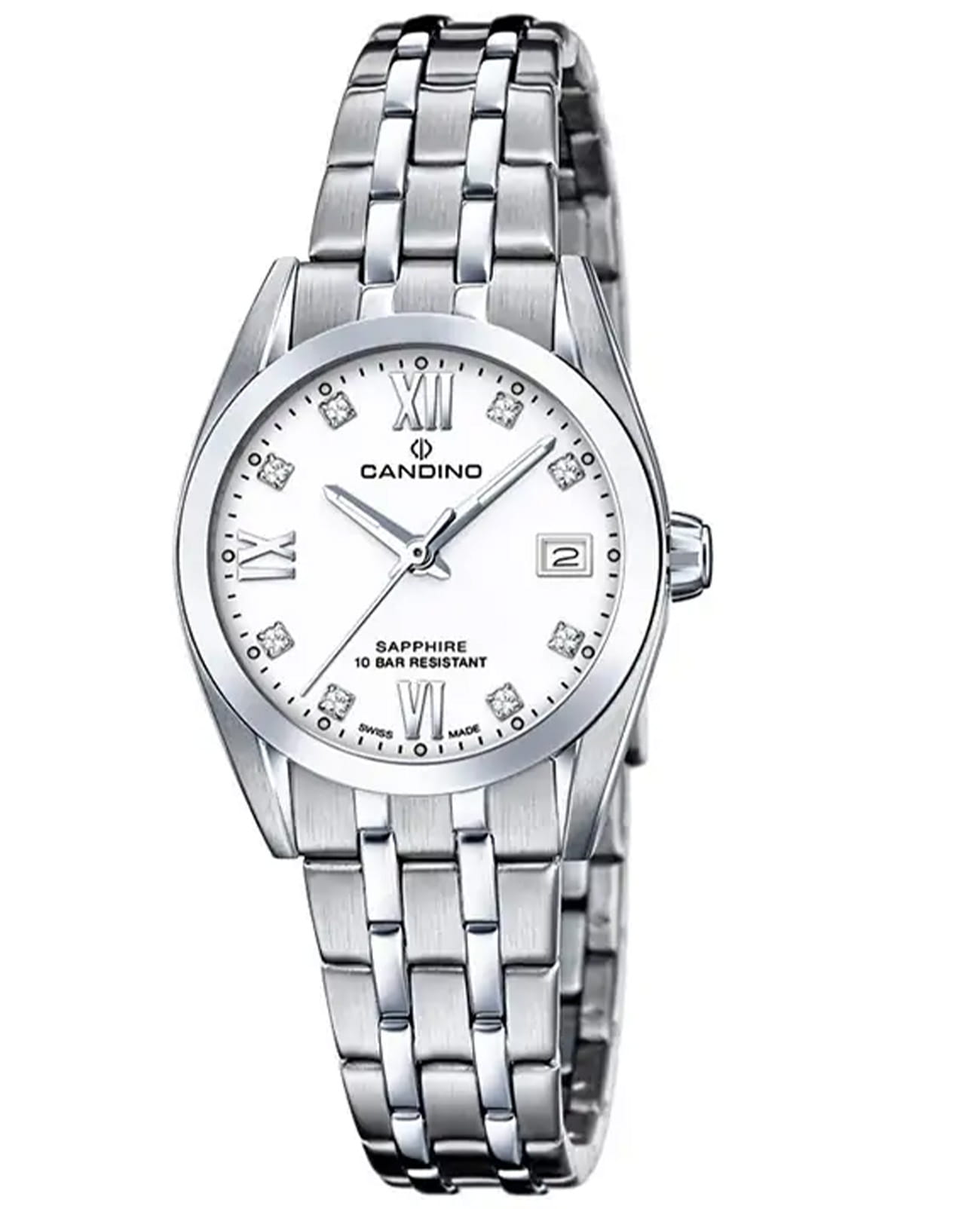 Женские швейцарские часы с сапфировым стекломСапфировое стеклоПрочный и надёжный материал из кристалла сапфира синтетического происхождения, характеризующийся особой твёрдостью и устойчивостью к царапинам и повреждениям. Candino Couple Quartz C4703/A, кварцевый механизм с высокой точностью. Сапфировое стеклоСапфировое стеклоПрочный и надёжный материал из кристалла сапфира синтетического происхождения, характеризующийся особой твёрдостью и устойчивостью к царапинам и повреждениям. устойчивое к появлению царапин, обладающее высокой прозрачностью. Класс водозащиты: 100 метров, позволит плавать, нырять и заниматься другими водными видами спорта. Корпус часов изготовлен из стали. Браслет с раскладной застёжкойРаскладная застёжкаТакой тип застёжки используется только на браслетах из металла. Она никогда не раскрывается полностью, происходит разделение на 2 и более частей. Раскладывающая застёжка снизит вероятность потери часов к минимуму.. Стрелки с люминесцентным покрытиемЛюминесцентное покрытиеПозволяет считывать показания времени в темноте. Производители наносят на стрелки, часовые индексы, безель или поверхность циферблата светонакопительный состав, дающий холодное свечение..