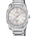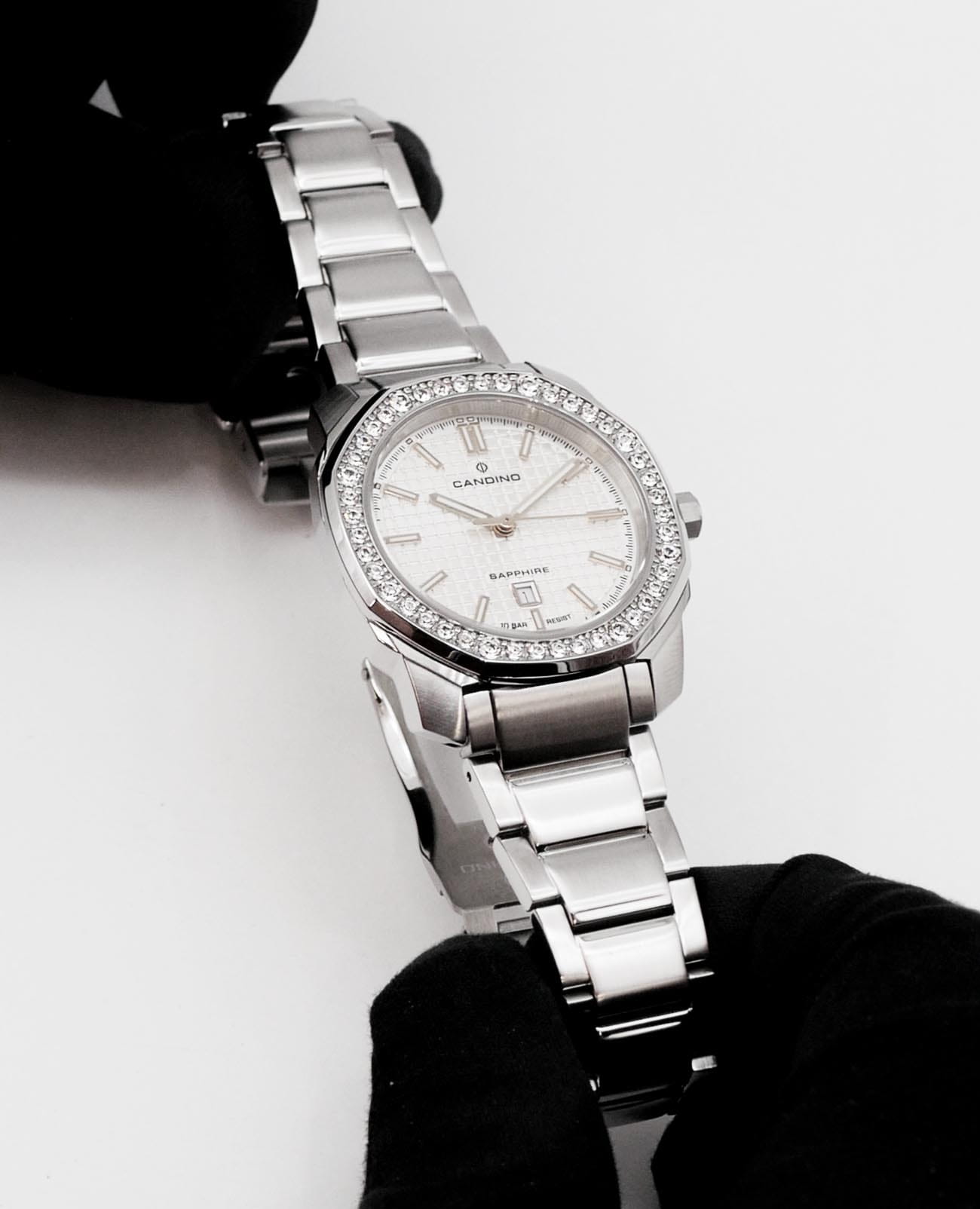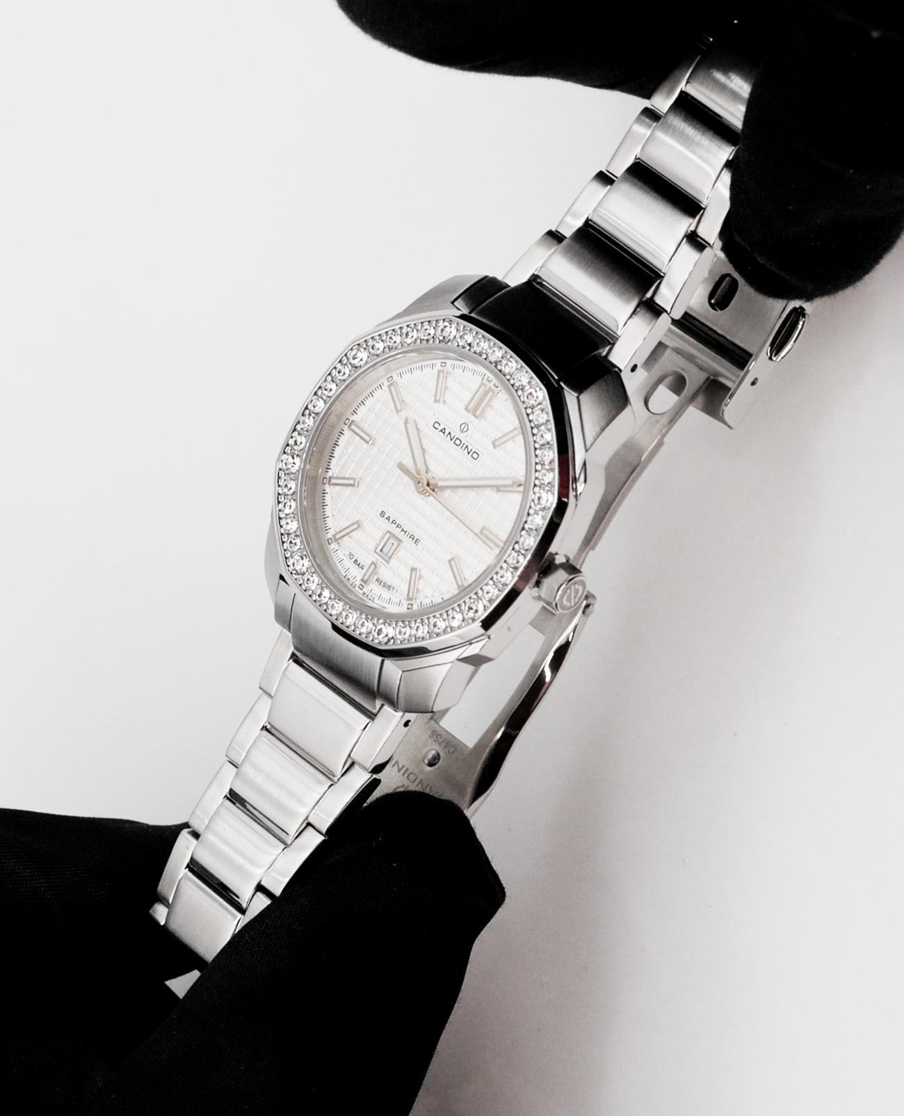 Женские наручные часы Candino Elegance C4756/1 с надёжным кварцевым механизмом. Корпус и браслет часов изготовлены из нержавеющей стали. Сапфировое стеклоСапфировое стеклоПрочный и надёжный материал из кристалла сапфира синтетического происхождения, характеризующийся особой твёрдостью и устойчивостью к царапинам и повреждениям. повышенной прозрачности, устойчивое к мелким механическим повреждениям. Стальной браслет на раскладной застёжкеРаскладная застёжкаТакой тип застёжки используется только на браслетах из металла. Она никогда не раскрывается полностью, происходит разделение на 2 и более частей. Раскладывающая застёжка снизит вероятность потери часов к минимуму.. Стрелки и метки с люминесцентным покрытиемЛюминесцентное покрытиеПозволяет считывать показания времени в темноте. Производители наносят на стрелки, часовые индексы, безель или поверхность циферблата светонакопительный состав, дающий холодное свечение.. БезельБезельВнешний ободок, закрепляющий стекло. В спортивных часах так называется поворотное кольцо с делениями на циферблате, выполняет роль таймера – замеряет отрезки времени на шкале. Неподвижный безель – элемент декора. Однонаправленно вращающийся безель на дайверских часах позволяет фиксировать моменты погружения и выныривания на поверхность. инкрустирован кристаллами. Класс водозащиты: 100 метров, позволит плавать, нырять и заниматься другими водными видами спорта. Окошко даты находится в положении 6 часов.