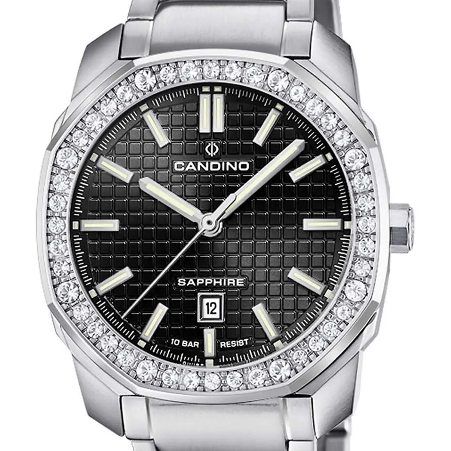 Женские наручные часы Candino Elegance C4756/5 с надёжным кварцевым механизмом. Корпус и браслет часов изготовлены из нержавеющей стали. Сапфировое стеклоСапфировое стеклоПрочный и надёжный материал из кристалла сапфира синтетического происхождения, характеризующийся особой твёрдостью и устойчивостью к царапинам и повреждениям. повышенной прозрачности, устойчивое к мелким механическим повреждениям. Стальной браслет на раскладной застёжкеРаскладная застёжкаТакой тип застёжки используется только на браслетах из металла. Она никогда не раскрывается полностью, происходит разделение на 2 и более частей. Раскладывающая застёжка снизит вероятность потери часов к минимуму.. Стрелки и метки с люминесцентным покрытиемЛюминесцентное покрытиеПозволяет считывать показания времени в темноте. Производители наносят на стрелки, часовые индексы, безель или поверхность циферблата светонакопительный состав, дающий холодное свечение.. БезельБезельВнешний ободок, закрепляющий стекло. В спортивных часах так называется поворотное кольцо с делениями на циферблате, выполняет роль таймера – замеряет отрезки времени на шкале. Неподвижный безель – элемент декора. Однонаправленно вращающийся безель на дайверских часах позволяет фиксировать моменты погружения и выныривания на поверхность. инкрустирован кристаллами. Класс водозащиты: 50 метров, позволит защитить корпус от случайных брызг или капель дождя. Окошко даты находится в положении 6 часов.