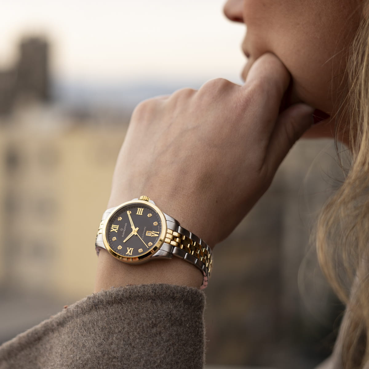 Женские наручные часы Candino Lady Elegance Date C4767/5 с надёжным кварцевым механизмом. Корпус и браслет часов изготовлены из нержавеющей стали. Сапфировое стеклоСапфировое стеклоПрочный и надёжный материал из кристалла сапфира синтетического происхождения, характеризующийся особой твёрдостью и устойчивостью к царапинам и повреждениям. повышенной прозрачности, устойчивое к мелким механическим повреждениям. Стальной браслет с частичным PVD-покрытиемPVDУльтратонкое покрытие наносится в технике вакуумного напыления, сочетает в себе нитрид титана особой прочности со слоем золота или оксида хрома. Несёт в себе декоративную или защитную функцию. на раскладной застёжкеРаскладная застёжкаТакой тип застёжки используется только на браслетах из металла. Она никогда не раскрывается полностью, происходит разделение на 2 и более частей. Раскладывающая застёжка снизит вероятность потери часов к минимуму.. Стрелки с люминесцентным покрытиемЛюминесцентное покрытиеПозволяет считывать показания времени в темноте. Производители наносят на стрелки, часовые индексы, безель или поверхность циферблата светонакопительный состав, дающий холодное свечение.. Циферблат инкрустирован кристаллами. Класс водозащиты: 50 метров, позволит защитить корпус от случайных брызг или капель дождя. Окошко даты находится в положении 6 часов.
