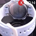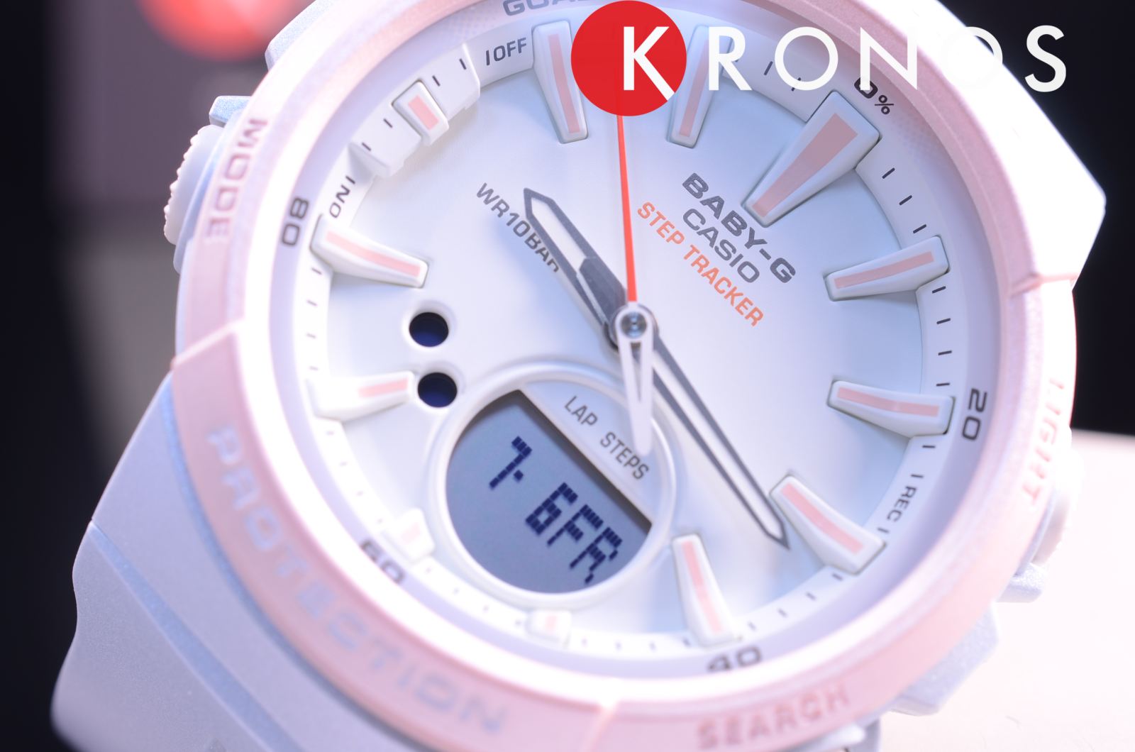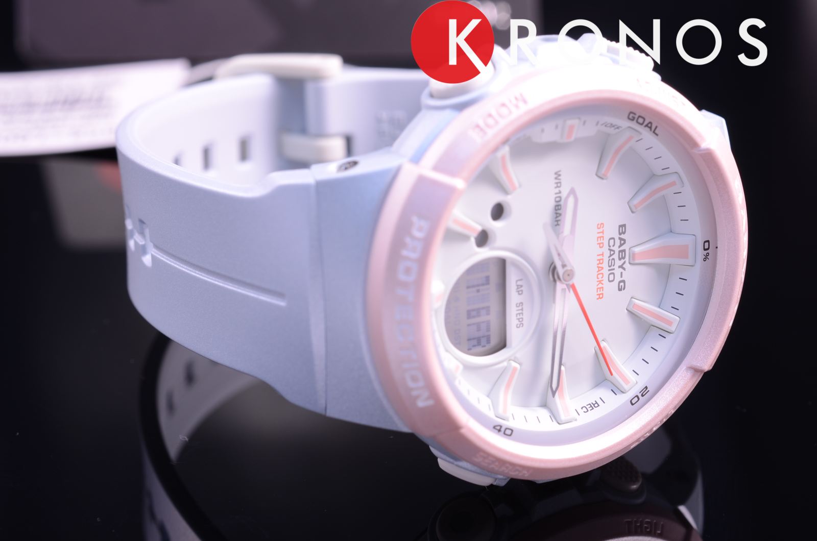 Спортивный аксессуар в пастельных оттенках поможет держать себя в форме благодаря таймеру, секундомеру, шагомеру. Счётчик измеряет пройденное количество шагов в диапазоне от 0 до 999999. Вокруг безеляБезельВнешний ободок, закрепляющий стекло. В спортивных часах так называется поворотное кольцо с делениями на циферблате, выполняет роль таймера – замеряет отрезки времени на шкале. Неподвижный безель – элемент декора. Однонаправленно вращающийся безель на дайверских часах позволяет фиксировать моменты погружения и выныривания на поверхность. нанесена шкала в процентах. Она помогает отслеживать план на день, отметка «Goal» обозначает выполнение намеченной цели. Часы выдерживают нагрузки и падение за счёт полимерного противоударного корпусаУдаропрочный корпусМеханизм заключён в корпус, выполненный из современных материалов, устойчивых к ударам, механическим повреждениям и падению с высоты: инновационный пластик, карбон, нержавеющая сталь, титан.. Японский кварцевый механизм. Срок службы батарейки составляет 2 года. Светодиодная подсветкаСветодиодная подсветкаСветодиодная или LED-подсветка обеспечивает появление яркого холодного свечения за счёт LED-элементов - маленьких лампочек. Они потребляют минимальное количество энергии, чаще всего можно встретить 1 светодиод, в нижней части циферблата. ЖК-дисплея и циферблата. Стрелки с люминесцентным покрытиемЛюминесцентное покрытиеПозволяет считывать показания времени в темноте. Производители наносят на стрелки, часовые индексы, безель или поверхность циферблата светонакопительный состав, дающий холодное свечение.. Водозащита 10 бар. Календарь, будильник, второй часовой пояс. Габариты: 42,6 x 45,2 x 13,3 мм.