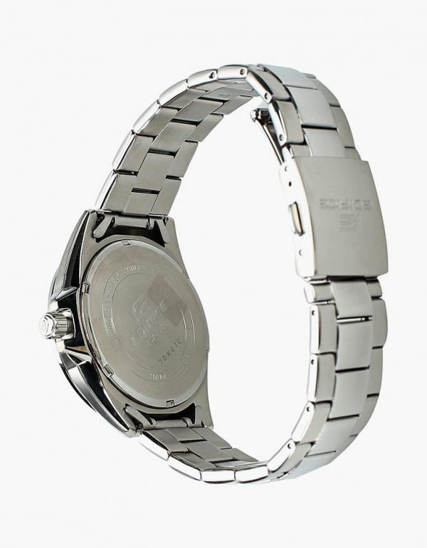 Брендовый аксессуар из серии EFV-100 будет отлично смотреться как с деловым костюмом, так и с повседневной одеждой. Стальной браслет на раскладной застёжкеРаскладная застёжкаТакой тип застёжки используется только на браслетах из металла. Она никогда не раскрывается полностью, происходит разделение на 2 и более частей. Раскладывающая застёжка снизит вероятность потери часов к минимуму.. Чёрный циферблат дополнен контрастными стрелками и метками, секундная стрелка облегчает читаемость показателей благодаря жёлтому наконечнику. Минималистичные часы выполнены из нержавеющей стали 316L, материал отличается долговечностью и устойчивостью к царапинам. Кварцевый механизм работает от батарейки, срок её службы составит 3 года. Подсветка NeobriteПодсветка NeobriteИспользование светонакопительных составов на основе сульфида цинка или алюмината стронция, яркий свет можно наблюдать на протяжении 6-10 часов после «зарядки» часов около источника света. продолжает светиться в темноте даже после непродолжительного пребывания на свету. Водостойкость 10 бар. Минеральное стеклоМинеральное стеклоМинеральное стекло представляет собой искусственно выращенный минерал кварца. Такое стекло отличается особой устойчивостью к повреждениям и царапинам. Уступает по некоторым качествам сапфировому стеклу.. Прямоугольная апертура даты. Габариты: 48 x 42 x 10,9 мм.