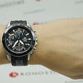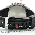 Расположение миниатюрных счётчиков на тёмном циферблате напоминает о приборной панели автомобиля, присутствуют ярко-голубые детали. Надёжный каучуковый ремешок отличается долговечностью и обеспечивает комфортное ношение. Сохраняется водостойкость при давлении 10 бар, чему дополнительно способствует завинчивающаяся задняя крышка. Кварцевый механизм с точностью +/- 20 секунд в месяц. Люминесцентная подсветкаЛюминесцентное покрытиеПозволяет считывать показания времени в темноте. Производители наносят на стрелки, часовые индексы, безель или поверхность циферблата светонакопительный состав, дающий холодное свечение.. Закаленное минеральное стекло. ХронографХронографФункция позволяет измерять отрезки времени с особой точностью: часы, минуты, секунды. Верным признаком хронографа является наличие на циферблате 3 дополнительных окошек-счётчиков., секундомер, отдельное окошко даты. Габариты: 53 x 47 x 12,1 мм.