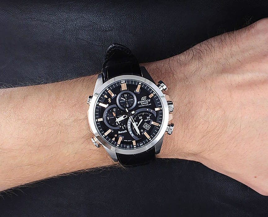 Брендовая модель наделена чёрным циферблатом с оранжевыми деталями, такое исполнение смотрится ярко и стильно. Современный аксессуар наделён технологией питания от солнечной батареи , позволяющей не задумываться о необходимости подзавода. При активированной функции сохранения энергии аккумулятор без подзарядки будет работать до 33 месяцев. Технология Bluetooth 4.0BluetoothСовременная технология, позволяющая синхронизировать часы с телефоном и переносить данные. Часы с Bluetooth расширяют возможности вашего смартфона и делают его использование ещё более удобным. с низким потреблением энергии. Ударопрочный корпусУдаропрочный корпусМеханизм заключён в корпус, выполненный из современных материалов, устойчивых к ударам, механическим повреждениям и падению с высоты: инновационный пластик, карбон, нержавеющая сталь, титан. из нержавеющей стали 316L. Закаленное минеральное стекло. Люминесцентная подсветка NeobriteПодсветка NeobriteИспользование светонакопительных составов на основе сульфида цинка или алюмината стронция, яркий свет можно наблюдать на протяжении 6-10 часов после «зарядки» часов около источника света.. Водонепроницаемость 10 бар. Возможность включения авиарежима. Чёрный ремешок из натуральной кожи. Завинчивающаяся заводная головка с защитой. Функция поиска телефона, расчёт средней скорости преодолённого маршрута, автоматический календарь, хронографХронографФункция позволяет измерять отрезки времени с особой точностью: часы, минуты, секунды. Верным признаком хронографа является наличие на циферблате 3 дополнительных окошек-счётчиков., секундомер, отображение уведомлений о входящих письмах электронной почты, будильник, мировое времяМировое время Полезное часовое усложнение, отображающее время в основных городах и известных областях по всему миру, оно связано с часовыми поясами, удобно для путешественников и бизнесменов. . Габариты: 52 x 48,1 x 14,1 мм.