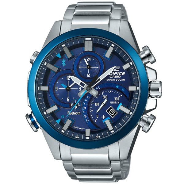 Стильный представитель автомобильной серии станет идеальным аксессуаром для ежедневного ношения. Наручные часы показывают действительно точное время благодаря технологии Bluetooth 4.0BluetoothСовременная технология, позволяющая синхронизировать часы с телефоном и переносить данные. Часы с Bluetooth расширяют возможности вашего смартфона и делают его использование ещё более удобным., модель корректирует показатели с помощью синхронизации с интернет-сервером точного времени. Японский кварцевый механизм получает питание за счёт солнечной батареи, реализуется технология . Минеральное стекло. Ударопрочный корпусУдаропрочный корпусМеханизм заключён в корпус, выполненный из современных материалов, устойчивых к ударам, механическим повреждениям и падению с высоты: инновационный пластик, карбон, нержавеющая сталь, титан. и браслет из нержавеющей стали 316L. БезельБезельВнешний ободок, закрепляющий стекло. В спортивных часах так называется поворотное кольцо с делениями на циферблате, выполняет роль таймера – замеряет отрезки времени на шкале. Неподвижный безель – элемент декора. Однонаправленно вращающийся безель на дайверских часах позволяет фиксировать моменты погружения и выныривания на поверхность. с синим IP-покрытиемIP-покрытиеМетод ионного напыления. Демонстрирует повышенную устойчивость к истиранию, окислению и химическим веществам. Под воздействием высокого давления и температуры около 1500°C молекулы металла надёжно соединяются с частицами корпуса часов.. Возможность включить авиарежим. Заводная головка с системой защиты. Люминесцентная подсветкаЛюминесцентное покрытиеПозволяет считывать показания времени в темноте. Производители наносят на стрелки, часовые индексы, безель или поверхность циферблата светонакопительный состав, дающий холодное свечение.. Водонепроницаемость 10 бар. Отображение наличия поступивших сообщений электронной почты, будильник, секундомер, функция поиска телефона, хронографХронографФункция позволяет измерять отрезки времени с особой точностью: часы, минуты, секунды. Верным признаком хронографа является наличие на циферблате 3 дополнительных окошек-счётчиков., поиск телефона, отображение числа и дня недели, расчёт средней скорости пройденной дистанции. Габариты: 52 x 48,1 x 14,2 мм.