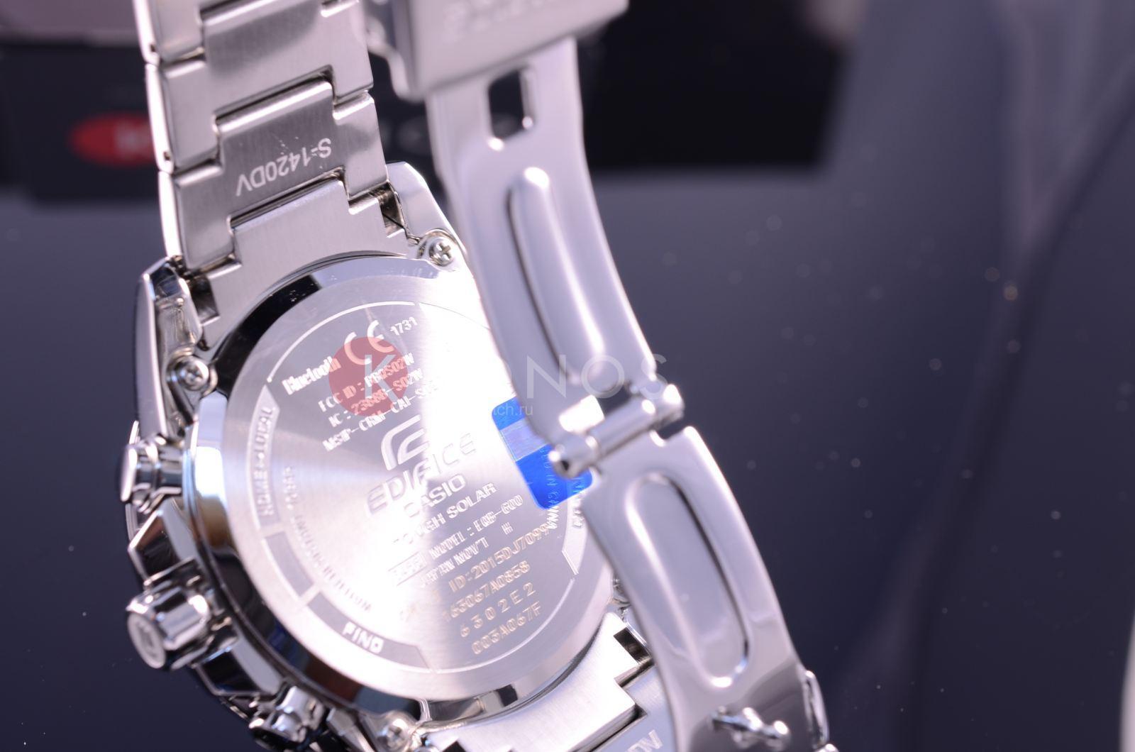 Высокотехнологичный аксессуар в чёрно-серебристой расцветке имеет лаконичное исполнение с оригинальными счётчиками на циферблате. Наручные часы Edifice Smartphone Link оснащены Bluetooth 4.0BluetoothСовременная технология, позволяющая синхронизировать часы с телефоном и переносить данные. Часы с Bluetooth расширяют возможности вашего смартфона и делают его использование ещё более удобным., позволяющей корректировать текущее время и копировать настройки мирового времениМировое время Полезное часовое усложнение, отображающее время в основных городах и известных областях по всему миру, оно связано с часовыми поясами, удобно для путешественников и бизнесменов. с помощью интернет-сервиса. Часы не нуждаются в подзаводе благодаря технологии питания от солнечного света . Без подзарядки модель может проработать до 5 месяцев. Люминесцентная подсветка NeobriteПодсветка NeobriteИспользование светонакопительных составов на основе сульфида цинка или алюмината стронция, яркий свет можно наблюдать на протяжении 6-10 часов после «зарядки» часов около источника света.. Авиарежим. Минеральное стекло. Ударопрочный корпусУдаропрочный корпусМеханизм заключён в корпус, выполненный из современных материалов, устойчивых к ударам, механическим повреждениям и падению с высоты: инновационный пластик, карбон, нержавеющая сталь, титан. и браслет из нержавеющей стали 316L. Водостойкость 100 метров. Завинчивающаяся заводная головка. Функция поиска телефона, приём уведомлений о новых письмах электронной посты, секундомер, автоматический календарь, расчёт средней скорости пройденного маршрута. Габариты: 47,3 x 51,9 x 13,3 мм.