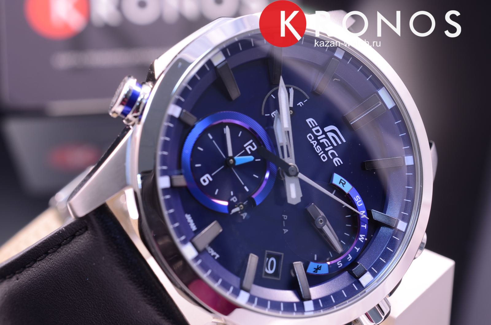 Edifice Bluetooth. Питание от солнечной энергии, индикатор низкого заряда батареи. Функция автоматического сохранения энергии. Светонакопительное покрытие необрит продолжает светиться в темноте даже после непродолжительного пребывания на свету. Беспроводная технология Bluetooth® 4.0 со сверхнизким потреблением энергии для синхронизации со смартфоном. При подключении к смартфону часы корректируют текущее время, а также копируют настройки мирового времени. Функция поиска телефона. Второй часовой пояс. Ретроградный указатель дня недели. Завинчивающаяся заводная головка с защитой, застежка бабочка.