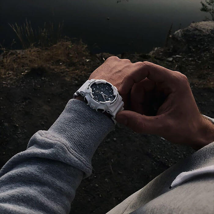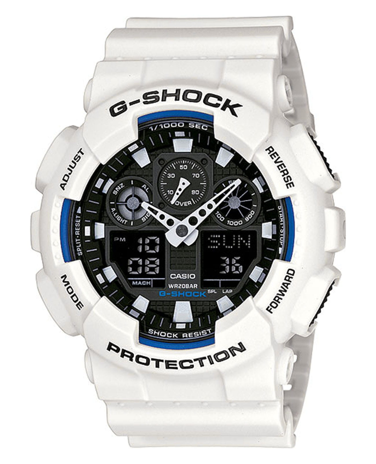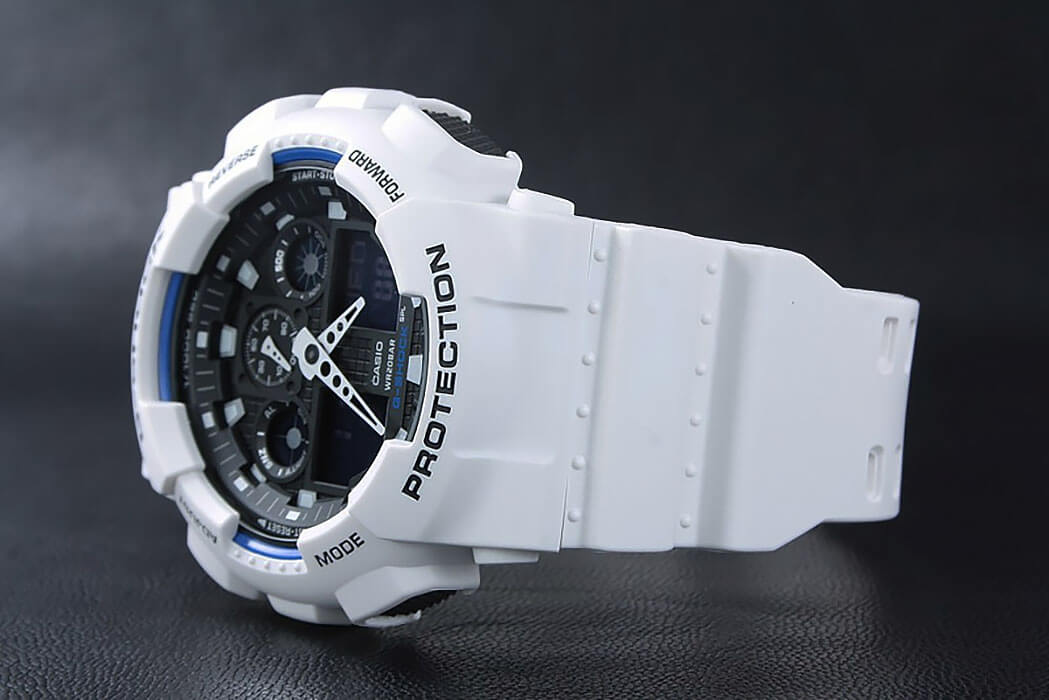 Японские мужские часы-хронографХронографФункция позволяет измерять отрезки времени с особой точностью: часы, минуты, секунды. Верным признаком хронографа является наличие на циферблате 3 дополнительных окошек-счётчиков. Casio G-Shock GA-100B-7A из коллекции G-Shock. Противоударный пластиковый корпус с карбоновыми волокнами более прочный и, в то же время, более легкий. Минеральное стеклоМинеральное стеклоМинеральное стекло представляет собой искусственно выращенный минерал кварца. Такое стекло отличается особой устойчивостью к повреждениям и царапинам. Уступает по некоторым качествам сапфировому стеклу. устойчивое к появлению царапин, обладающее высокой прозрачностью. Ударопрочный корпусУдаропрочный корпусМеханизм заключён в корпус, выполненный из современных материалов, устойчивых к ударам, механическим повреждениям и падению с высоты: инновационный пластик, карбон, нержавеющая сталь, титан. защищает механизм от ударов и вибрации. Многокомпонентный циферблат состоит из цифровых окошек указателей числа и дня недели, а также индикатора режима работы часов, который расположен в позиции 9 часов и выполнен в виде пропеллера. Светодиодная подсветкаСветодиодная подсветкаСветодиодная или LED-подсветка обеспечивает появление яркого холодного свечения за счёт LED-элементов - маленьких лампочек. Они потребляют минимальное количество энергии, чаще всего можно встретить 1 светодиод, в нижней части циферблата. освещает весь циферблат. Мировое времяМировое время Полезное часовое усложнение, отображающее время в основных городах и известных областях по всему миру, оно связано с часовыми поясами, удобно для путешественников и бизнесменов. – 48 городов (29 часовых поясов). СекундомерСекундомерСекундоме́р — прибор, способный измерять интервалы времени с точностью до долей секунды. с точностью измерения 1/100 секунды и измерением до 23 часов 59 минут 59,99 cек. ТаймерТаймерОтсчитывает секунды в обратном направлении в заданном интервале времени. обратного отсчета (диапазон времени 24 часа), автоматический календарь, 12/24 отображение времени. 5 будильниковБудильникБуди́льник — часы, в заданный момент времени подающие звуковой, световой и/или в редких случаях другой сигнал., ежечасный сигнал. Класс водозащиты: 200 метров, позволит плавать, нырять и заниматься другими водными видами спорта. Ремешок из полимерного материала на стандартной застежке.