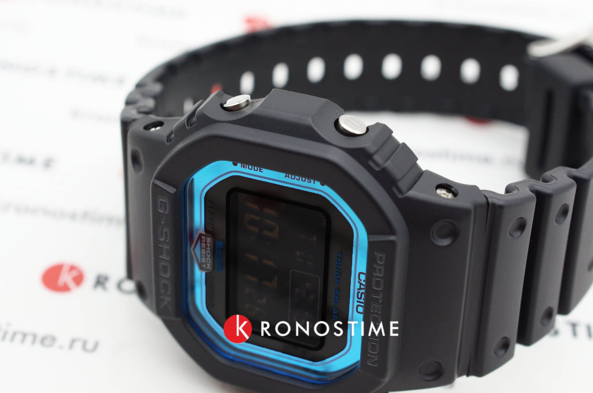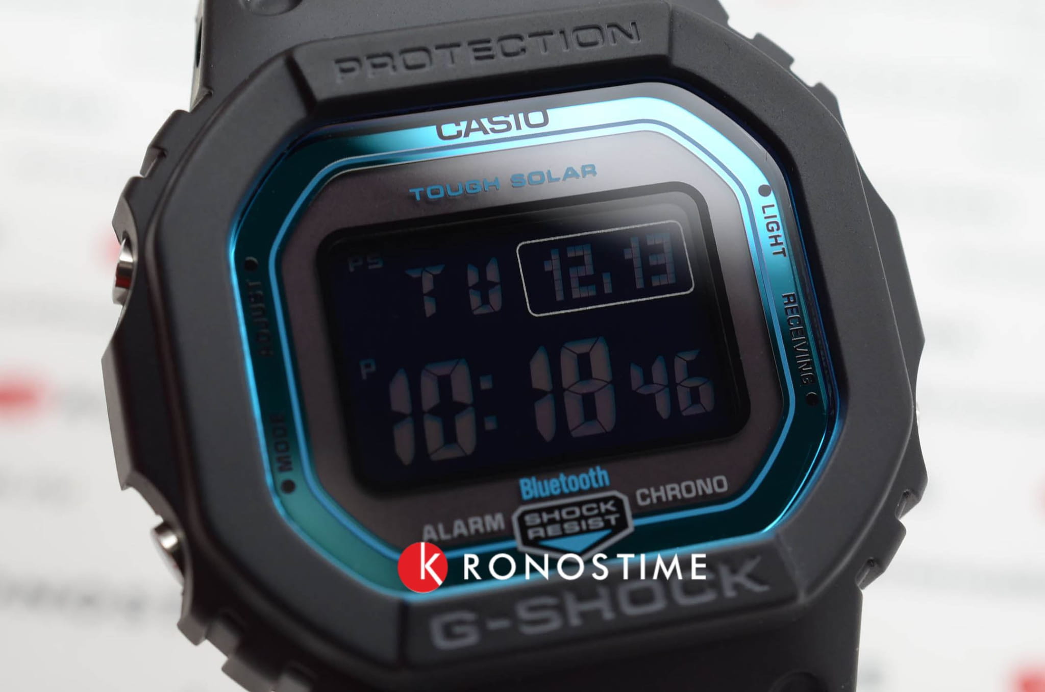Модель с синими элементами оформления имеет классический для часов Casio 8-угольный противоударный корпусУдаропрочный корпусМеханизм заключён в корпус, выполненный из современных материалов, устойчивых к ударам, механическим повреждениям и падению с высоты: инновационный пластик, карбон, нержавеющая сталь, титан., благодаря которому дизайн приобретает узнаваемые черты. Аксессуар выполнен из полимерного материала, устойчивого к ударам, повреждениям, вибрации, падению. Синхронизация времени и настройка функций осуществляется с помощью технологии BluetoothBluetoothСовременная технология, позволяющая синхронизировать часы с телефоном и переносить данные. Часы с Bluetooth расширяют возможности вашего смартфона и делают его использование ещё более удобным., управление возможностями происходит в приложении на телефоне G-Shock Connected. Японский кварцевый калибр. Питание от солнечного света . Автоматический переход в режим сохранения энергии для экономии расхода батареи. Минеральное стекло. Электролюминесцентная подсветкаЭлектролюминесцентная подсветкаЭлектролюминесцентная панель устанавливается под ЖК-экраном часов, при нажатии кнопки электричество преобразуется в свет за счёт подачи напряжения на атомы фосфора, такой тип подсветки позволяет освещать весь циферблат.. Водонепроницаемость до 200 метров. Секундомер, коррекция текущего времени радиосигналом, таймер, хронографХронографФункция позволяет измерять отрезки времени с особой точностью: часы, минуты, секунды. Верным признаком хронографа является наличие на циферблате 3 дополнительных окошек-счётчиков., будильник, мировое времяМировое время Полезное часовое усложнение, отображающее время в основных городах и известных областях по всему миру, оно связано с часовыми поясами, удобно для путешественников и бизнесменов. , календарь. Габариты: 48,9 x 42,8 x 13,4 мм.
