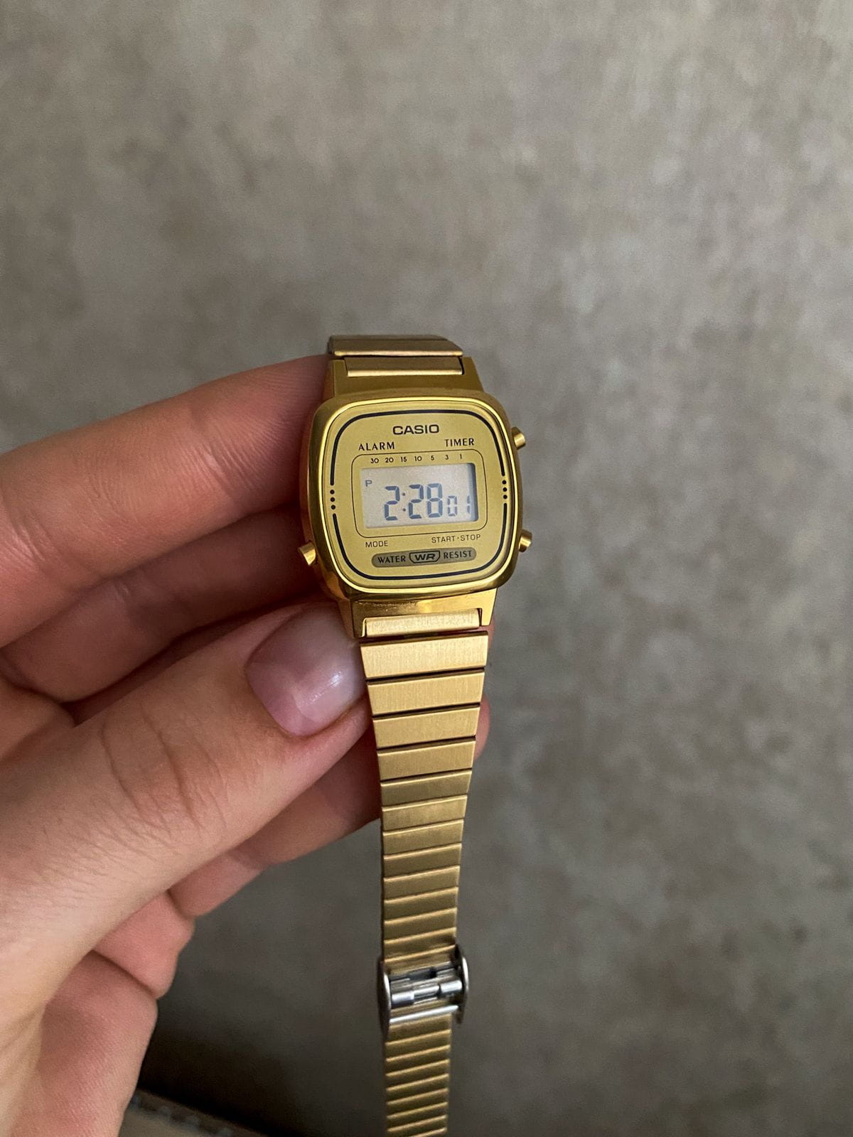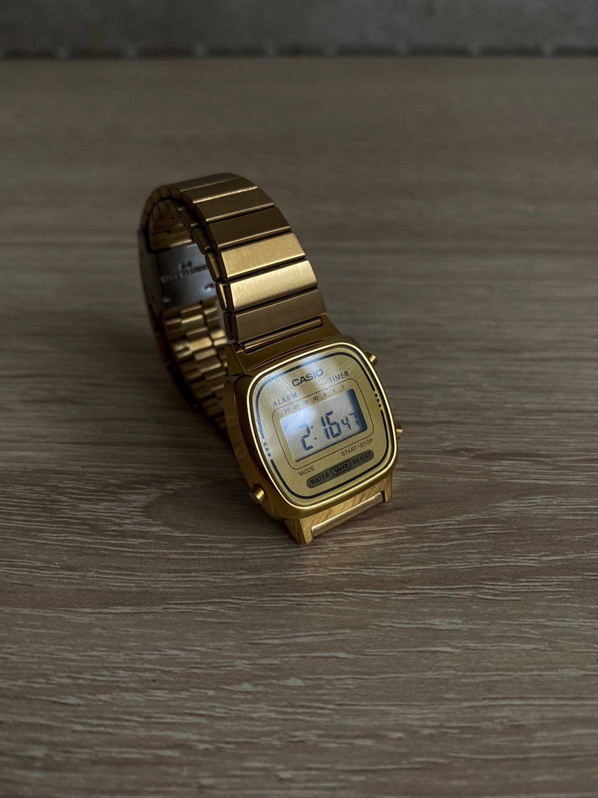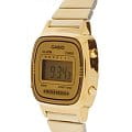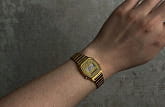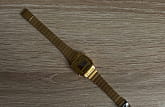 Женские электронные часы. Оснащены функциями: секундомера, таймера, календаря и подсветки. Корпус - Пластиковый; Стекло - Пластик; Водозащита - 30 м. (WR 30); Материал ремешка - Нержавеющая сталь, PVD покрытие; Цвет ремешка - Золотистый; Цвет циферблата - Золотой.