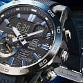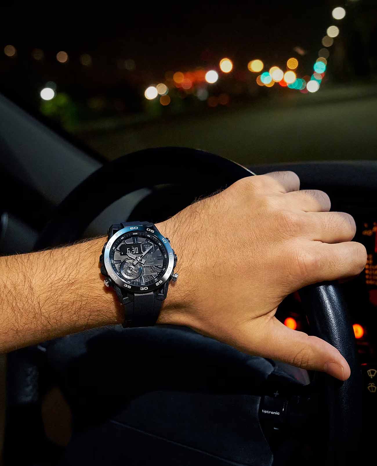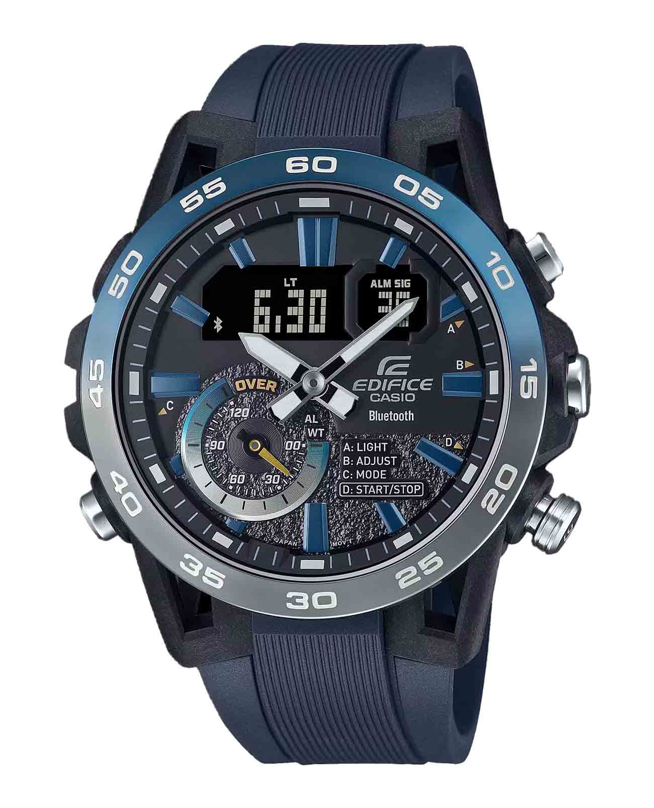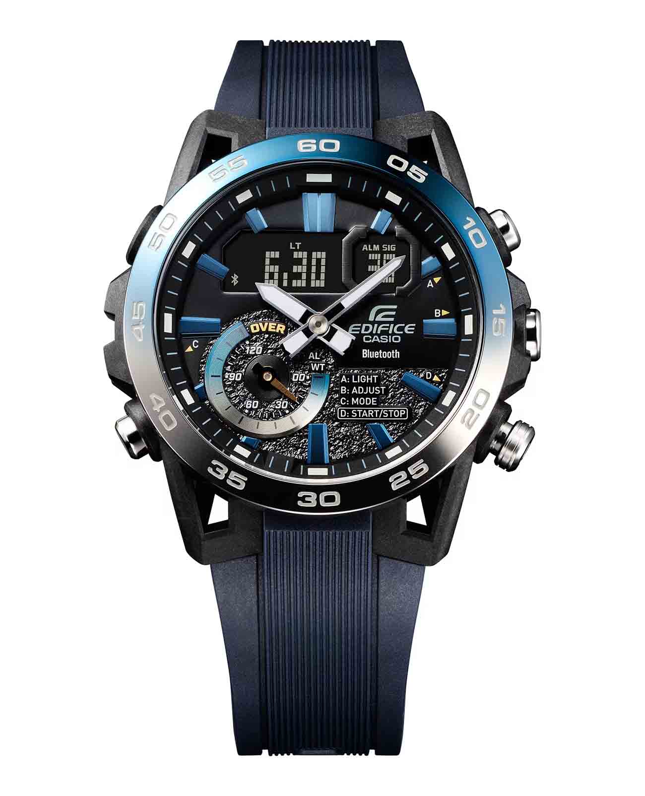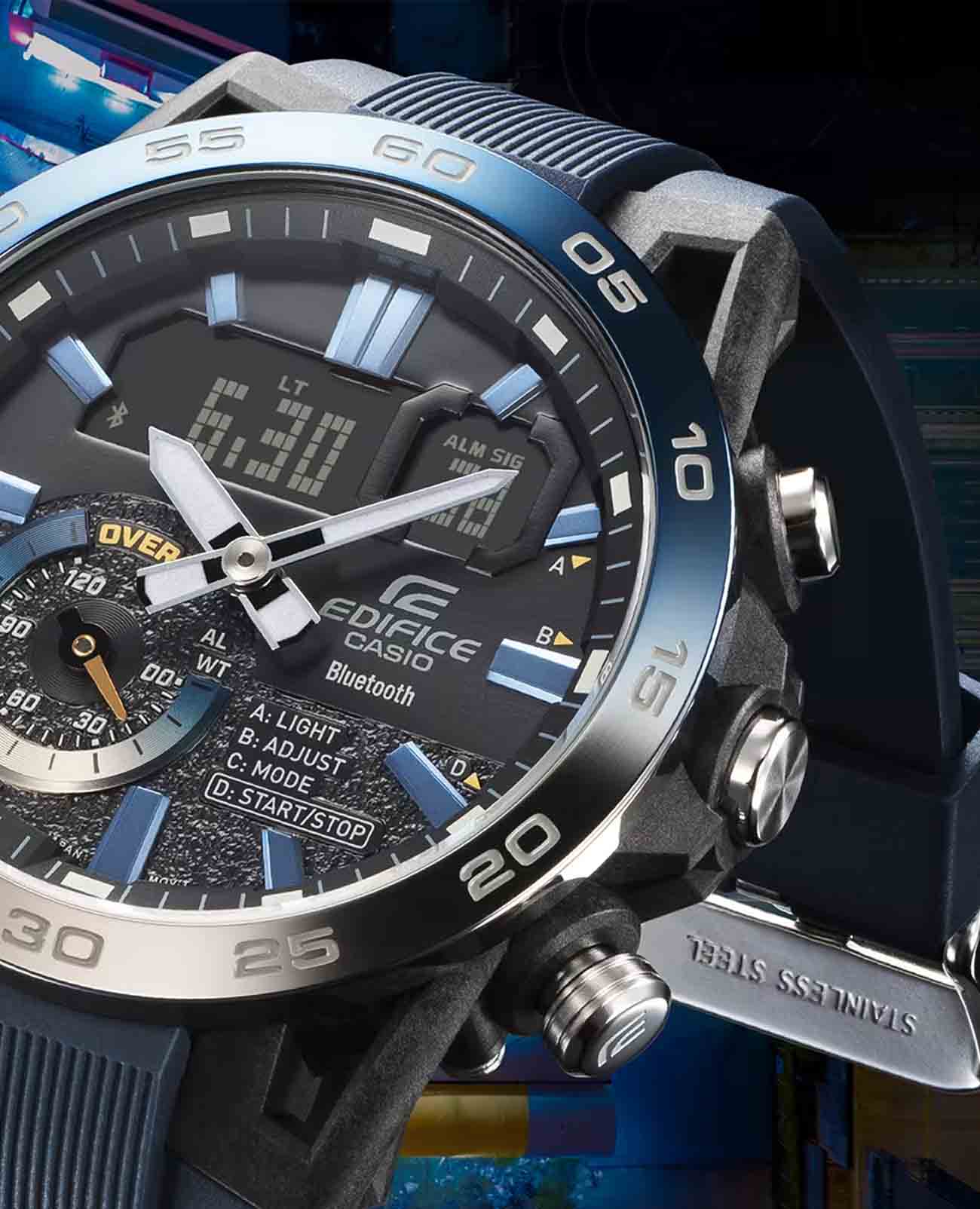 Мужские часы, дизайн которых вдохновлен воздушным потоком вокруг гоночного автомобиля. Многофункциональные японские мужские часы с BluetoothBluetoothСовременная технология, позволяющая синхронизировать часы с телефоном и переносить данные. Часы с Bluetooth расширяют возможности вашего смартфона и делают его использование ещё более удобным. Casio Edifice Sospensione ECB-40NP-1ADF, кварцевый механизм с высокой точностью. Корпус часов изготовлен из карбона со стальной вставкой с IP-покрытиемIP-покрытиеМетод ионного напыления. Демонстрирует повышенную устойчивость к истиранию, окислению и химическим веществам. Под воздействием высокого давления и температуры около 1500°C молекулы металла надёжно соединяются с частицами корпуса часов.. Питание от солнечной энергии Tough SolarTough SolarТехнология основана на подзарядке аккумулятора от источника солнечного света, специальная панель улавливает солнечные лучи и преобразует их в энергию для работы часов. Достаточно пары минут нахождения на солнце для функционирования часов в течении суток. - солнечные батарейки большой мощности, индикатор заряда батареи. Функция автоматического сохранения энергии. Время работы аккумулятора без подзарядки приблизительно 7 месяцев, при включенной функции сохранения энергии приблизительно 18 месяцев. Двойная подcветка: циферблат и ЖК-дисплеи подсвечиваются светодиодомСветодиодная подсветкаСветодиодная или LED-подсветка обеспечивает появление яркого холодного свечения за счёт LED-элементов - маленьких лампочек. Они потребляют минимальное количество энергии, чаще всего можно встретить 1 светодиод, в нижней части циферблата., благодаря наличию функции задержки, после отпускания кнопки освещение горит еще несколько секунд. Настраиваемое послесвечение 1,5 или 3сек. Подсветка NeobriteПодсветка NeobriteИспользование светонакопительных составов на основе сульфида цинка или алюмината стронция, яркий свет можно наблюдать на протяжении 6-10 часов после «зарядки» часов около источника света. обеспечивает длительное послесвечение в темноте даже после кратковременного нахождения на свету. 12-ти и 24-х часовой формат времени. СекундомерСекундомерСекундоме́р — прибор, способный измерять интервалы времени с точностью до долей секунды. с двумя точностями показаний: 1/100с (до 1ч) и 1с (после 1ч) и временем измерения 24ч. Сплит-хронографСплит-хронографИспользуется для измерения продолжительности нескольких временных отрезков, начинающихся одновременно, а заканчивающихся в разное время.. ТаймерТаймерОтсчитывает секунды в обратном направлении в заданном интервале времени. обратного отсчета от 1с до 1ч. Мировое времяМировое время Полезное часовое усложнение, отображающее время в основных городах и известных областях по всему миру, оно связано с часовыми поясами, удобно для путешественников и бизнесменов. – 38 городов (38 часовых поясов), всемирное координированное время (UTCUTCВсемирное кординационное время, не имеющее привязки к географическому положению Гринвича, основывается на атомном отсчёте времени. Регулировка времени осуществляется более точно, чем устаревшее GMT.