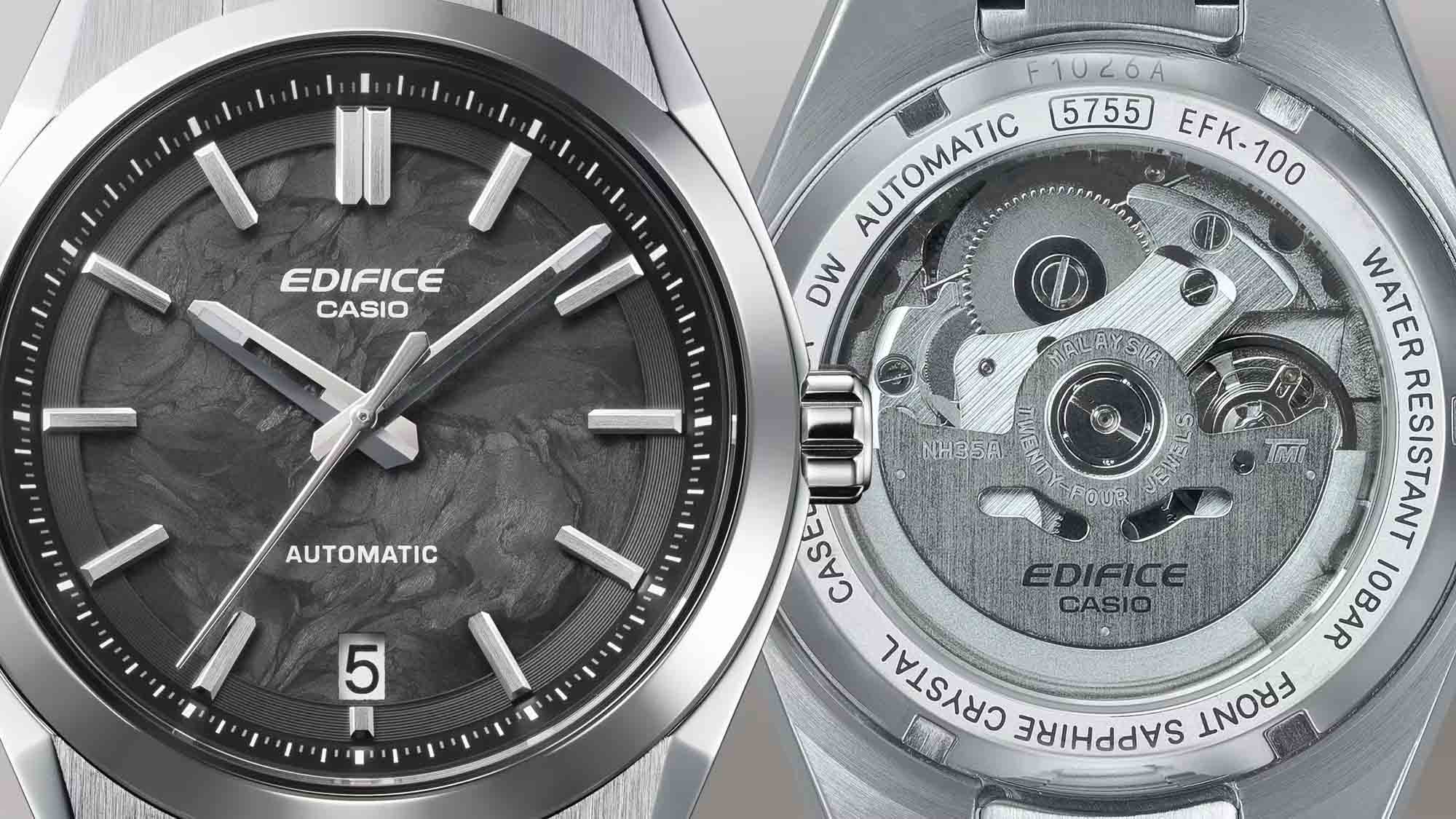 Мужские механические часы Casio Edifice EFK-100CD-1A — это стильный аксессуар, сочетающий в себе надёжность и функциональность. Модель выполнена из нержавеющей стали с размерами корпуса 43,5x39x12,5 мм, а его масса составляет 148 г. Защиту механизма обеспечивает сапфировое стеклоСапфировое стеклоПрочный и надёжный материал из кристалла сапфира синтетического происхождения, характеризующийся особой твёрдостью и устойчивостью к царапинам и повреждениям., устойчивое к повреждениям. Задняя пластина имеет прозрачную форму с винтовым замком, что позволяет наблюдать за работой механизма. Браслет из нержавеющей стали оснащён тройной застёжкой с одним касанием, обеспечивающей комфорт и надёжную фиксацию. Стандартный размер ремешка регулируется от 150 до 205 мм. Часы водонепроницаемы до 10 бар (, что позволяет использовать их при плавании и других водных активностях без глубокого погружения. Точность хода составляет ±45 секунд в день, а запас хода — около 40 часов. Часы имеют 24 драгоценных камня и частоту колебаний 21 600 полуколебаний в час. Эти часы станут универсальным аксессуаром для тех, кто ценит сочетание стиля, функциональности и надёжности — идеальный выбор для повседневной носки и активного образа жизни.