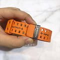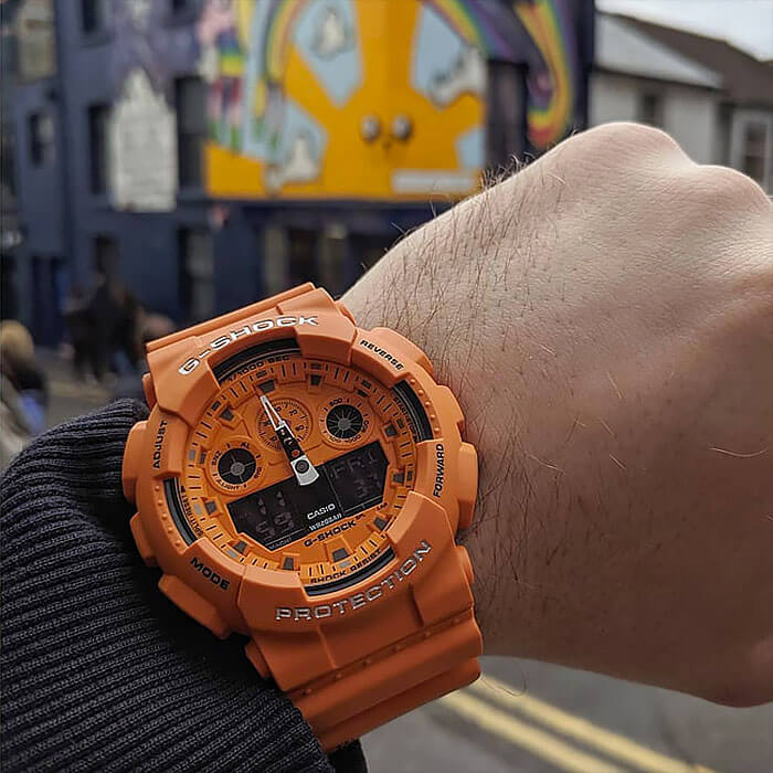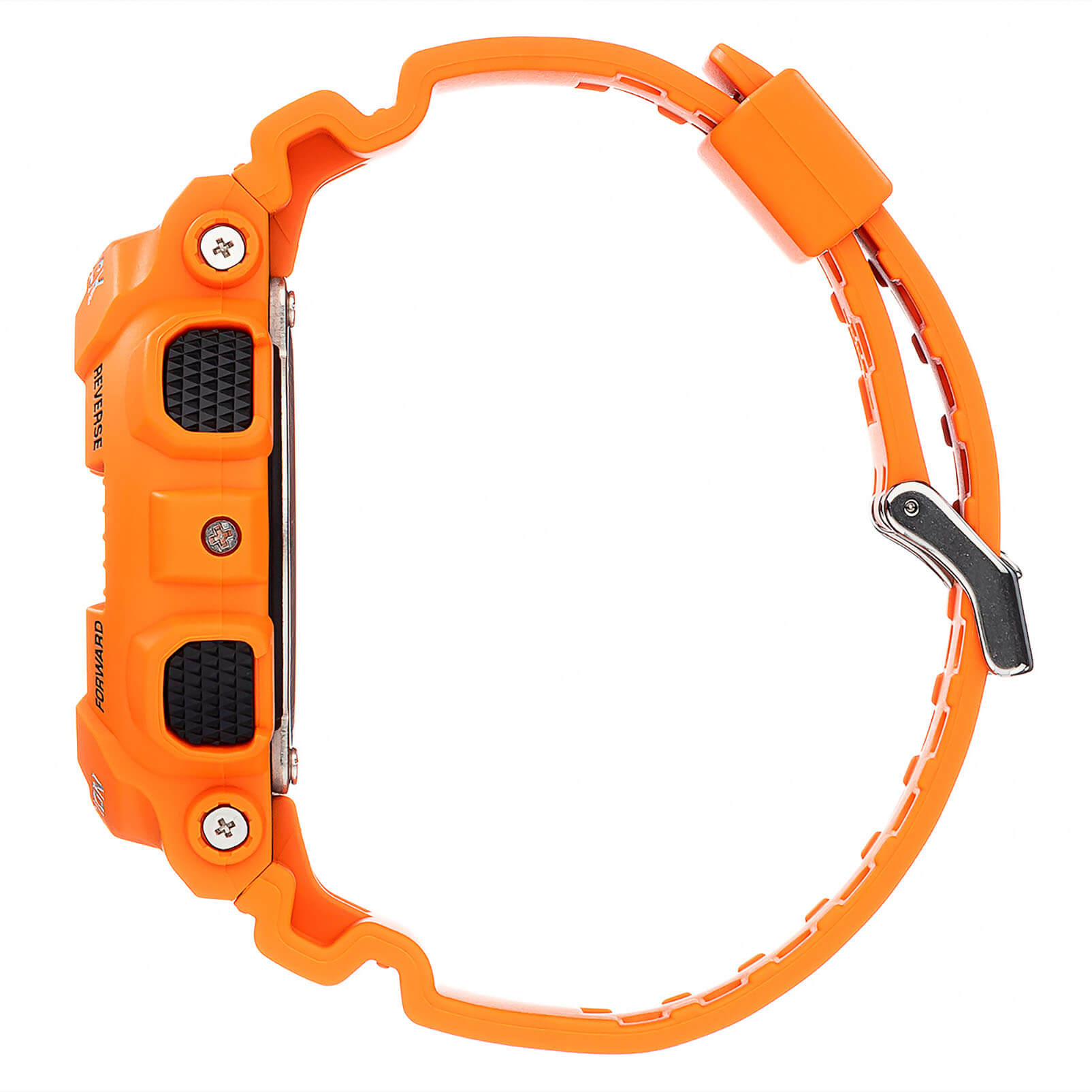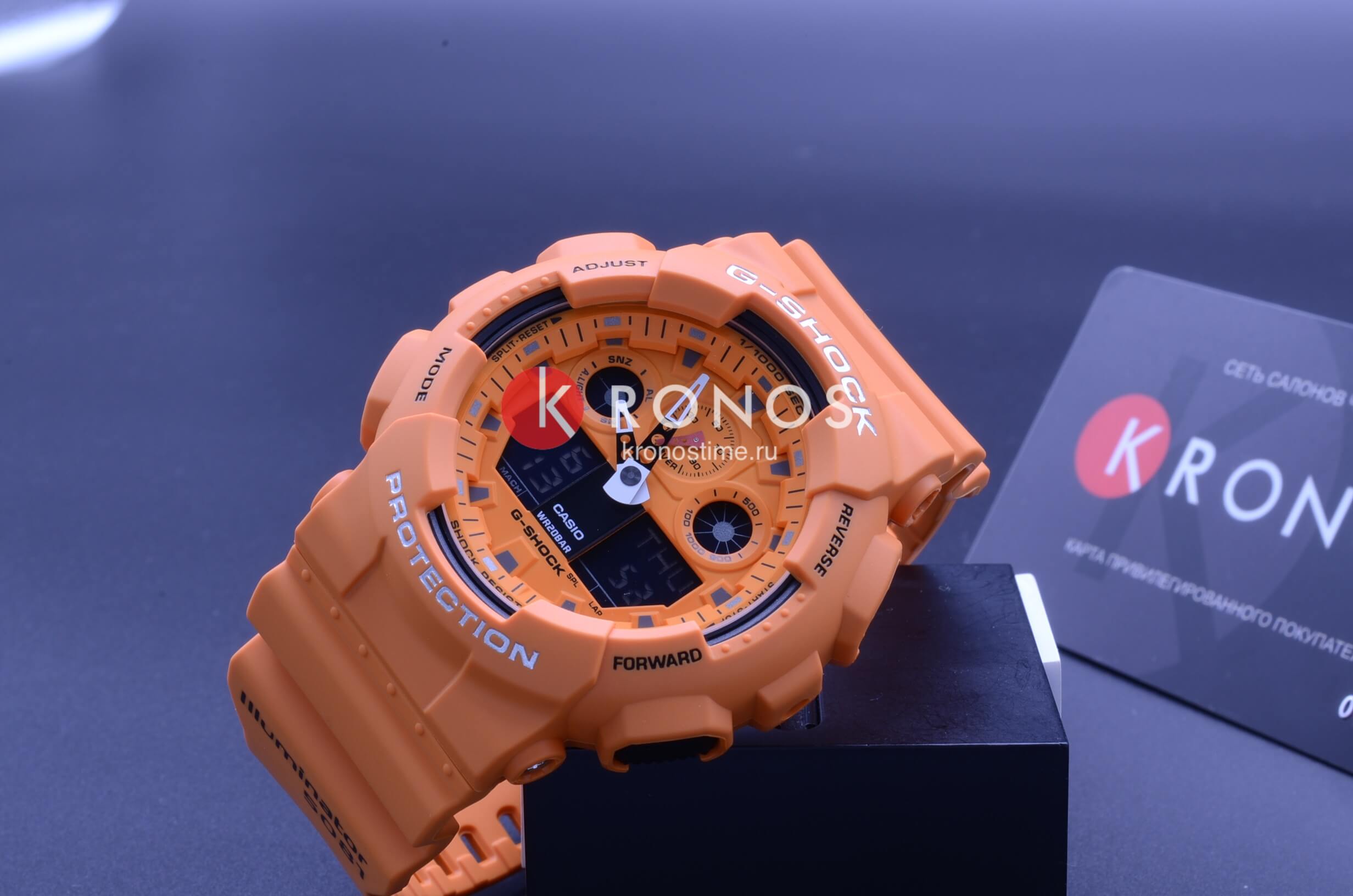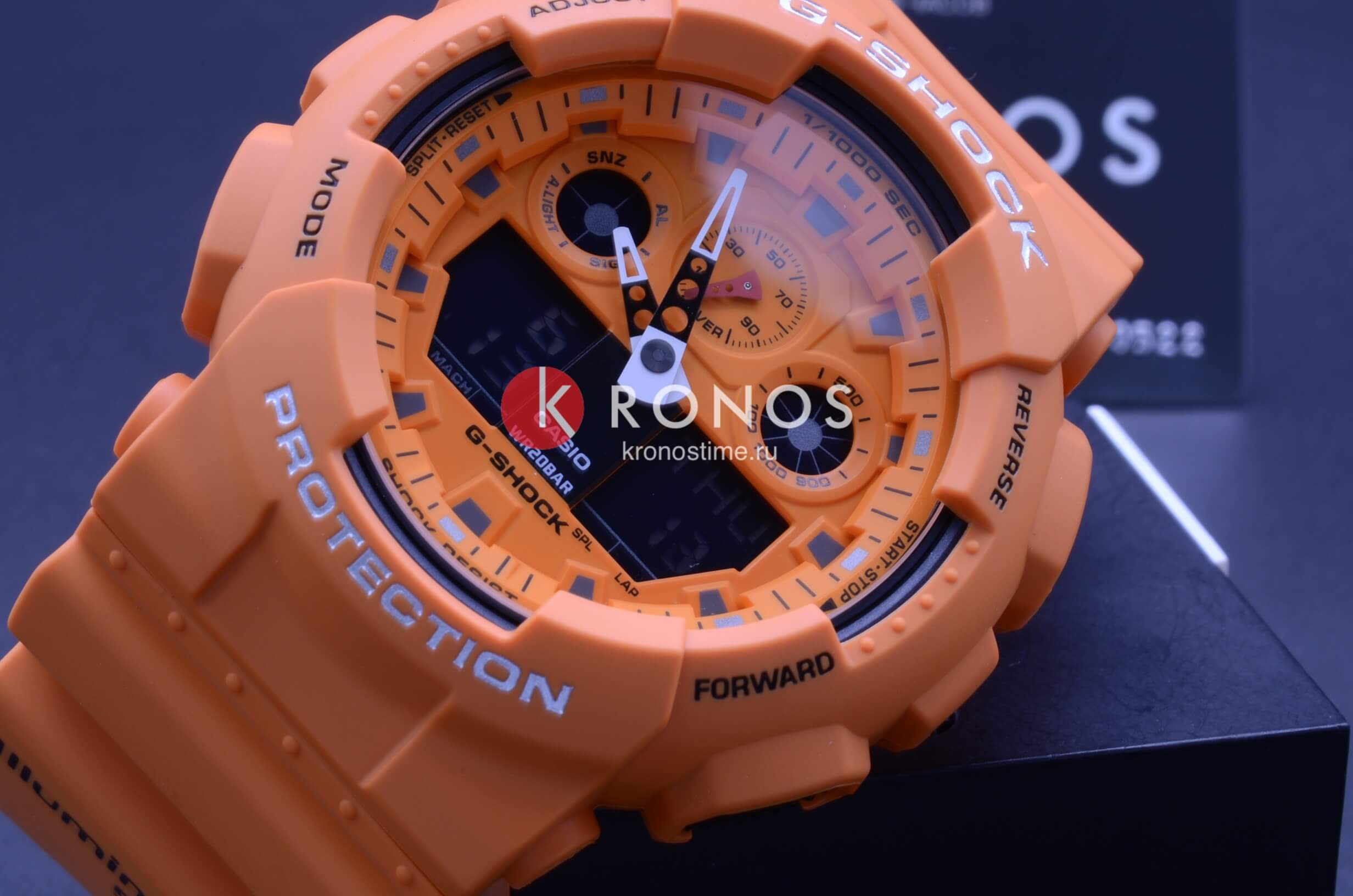 Наручные часы с оранжевым матовым корпусом выполнены в спортивном стиле, внимание привлекает циферблат "Three-eye" и перфорированные контрастные стрелки. Аксессуар серии G-Shock GA-100 выдерживает удары, падение с высоты, механические повреждения благодаря применению полимерного пластика. Кварцевый калибр японского производства получает питание от батарейки, срок службы которой - 2 года. Защита от воздействия магнитных полей. Надёжное минеральное стекло. Светодиодная подсветкаСветодиодная подсветкаСветодиодная или LED-подсветка обеспечивает появление яркого холодного свечения за счёт LED-элементов - маленьких лампочек. Они потребляют минимальное количество энергии, чаще всего можно встретить 1 светодиод, в нижней части циферблата. оранжевого цвета. Водостойкость до 20 бар. Мягкий и лёгкий полимерный ремешок. Таймер с автоповтором, мировое времяМировое время Полезное часовое усложнение, отображающее время в основных городах и известных областях по всему миру, оно связано с часовыми поясами, удобно для путешественников и бизнесменов. , секундомер, будильник, расчёт средней скорости по указанной дистанции, UTCUTCВсемирное кординационное время, не имеющее привязки к географическому положению Гринвича, основывается на атомном отсчёте времени. Регулировка времени осуществляется более точно, чем устаревшее GMT.