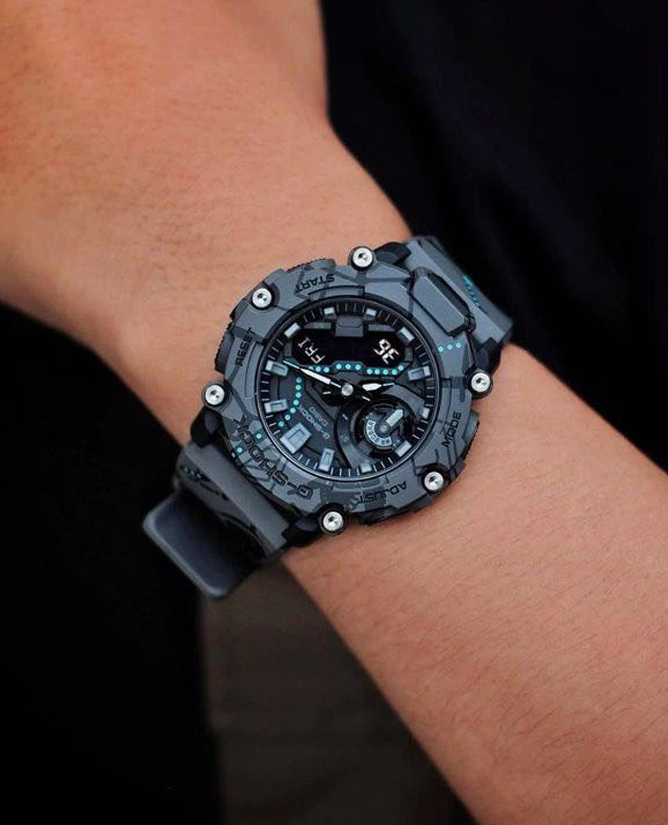 Японские мужские часы-хронографХронографФункция позволяет измерять отрезки времени с особой точностью: часы, минуты, секунды. Верным признаком хронографа является наличие на циферблате 3 дополнительных окошек-счётчиков. Casio G-Shock G-SHOCK GA-2200SBY-8A R из коллекции G-Shock. Корпус и циферблат украшены картой района Сибуя, который главным центром моды Токио. Структура Carbon Core Guard. Минеральное стеклоМинеральное стеклоМинеральное стекло представляет собой искусственно выращенный минерал кварца. Такое стекло отличается особой устойчивостью к повреждениям и царапинам. Уступает по некоторым качествам сапфировому стеклу. устойчивое к появлению царапин, обладающее высокой прозрачностью. Корпус часов изготовлен из полимерного материала. Светодиодная автоподсветка NeobriteПодсветка NeobriteИспользование светонакопительных составов на основе сульфида цинка или алюмината стронция, яркий свет можно наблюдать на протяжении 6-10 часов после «зарядки» часов около источника света. - при повороте часов в сторону лица подсветка дисплея осуществляется автоматически. Настраиваемое послесвечение 1,5 или 3сек. Ударопрочный корпусУдаропрочный корпусМеханизм заключён в корпус, выполненный из современных материалов, устойчивых к ударам, механическим повреждениям и падению с высоты: инновационный пластик, карбон, нержавеющая сталь, титан. защищает механизм от ударов и вибрации. СекундомерСекундомерСекундоме́р — прибор, способный измерять интервалы времени с точностью до долей секунды. с точностью измерения 1/100 секунды и измерением до 23 часов 59 минут 59,99 cек. ТаймерТаймерОтсчитывает секунды в обратном направлении в заданном интервале времени. обратного отсчета (диапазон времени 24 часа), автоматический календарь, 12/24 отображение времени, будильникБудильникБуди́льник — часы, в заданный момент времени подающие звуковой, световой и/или в редких случаях другой сигнал.. Типы сигналов: ежедневный, ежемесячный, каждый день определенного месяца, на определенную дату. Световая индикация сигнала. Батарея рассчитана на 3 года. Стальная задняя крышка крепится на 4-х винтах. Класс водозащиты: 200 метров, позволит плавать, нырять и заниматься другими водными видами спорта. Ремешок из полимерного материала на стандартной застежке.