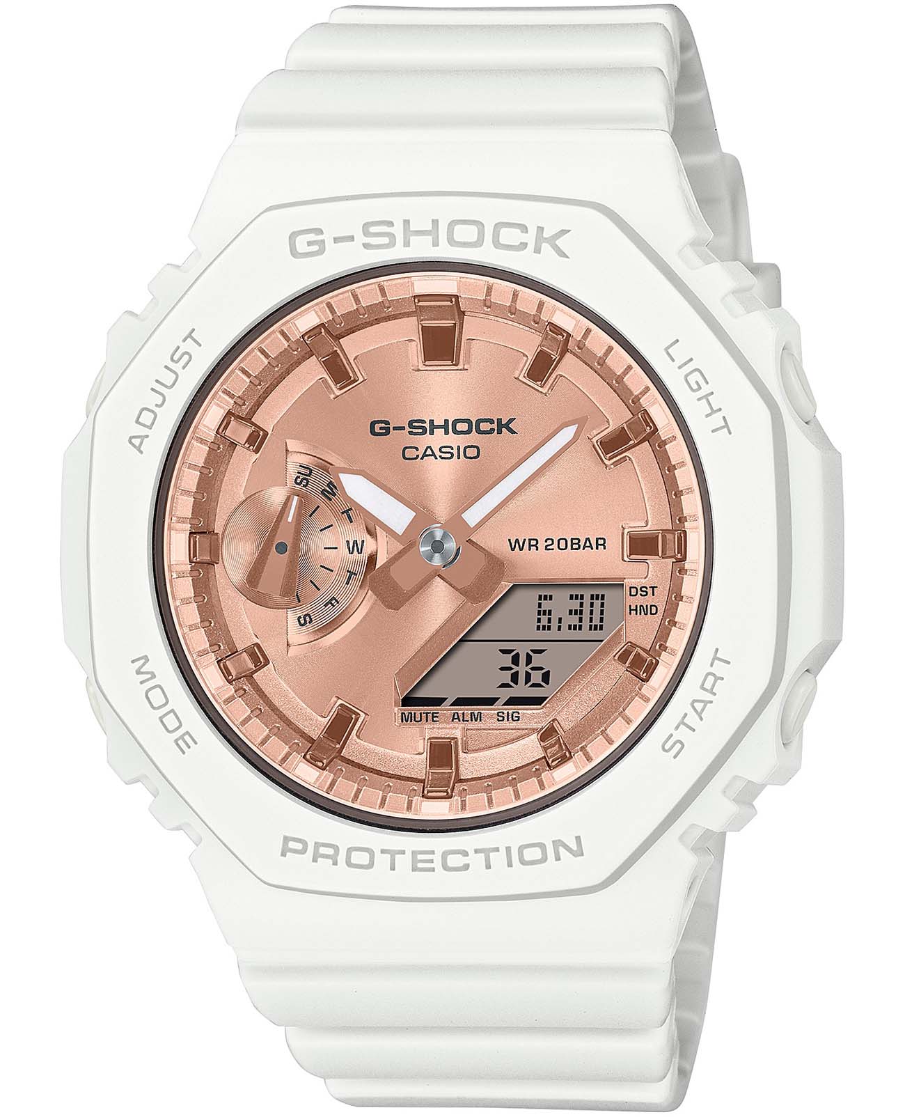 Японские женские часы-хронографХронографФункция позволяет измерять отрезки времени с особой точностью: часы, минуты, секунды. Верным признаком хронографа является наличие на циферблате 3 дополнительных окошек-счётчиков. Casio G-Shock GMA-S2100MD-7A из коллекции G-Shock. Минеральное стеклоМинеральное стеклоМинеральное стекло представляет собой искусственно выращенный минерал кварца. Такое стекло отличается особой устойчивостью к повреждениям и царапинам. Уступает по некоторым качествам сапфировому стеклу. устойчивое к появлению царапин, обладающее высокой прозрачностью. Ударопрочный корпусУдаропрочный корпусМеханизм заключён в корпус, выполненный из современных материалов, устойчивых к ударам, механическим повреждениям и падению с высоты: инновационный пластик, карбон, нержавеющая сталь, титан. защищает механизм от ударов и вибрации. Светодиодная автоподсветка NeobriteПодсветка NeobriteИспользование светонакопительных составов на основе сульфида цинка или алюмината стронция, яркий свет можно наблюдать на протяжении 6-10 часов после «зарядки» часов около источника света. - при повороте часов в сторону лица подсветка дисплея осуществляется автоматически. Настраиваемое послесвечение 1,5 или 3сек. Мировое времяМировое время Полезное часовое усложнение, отображающее время в основных городах и известных областях по всему миру, оно связано с часовыми поясами, удобно для путешественников и бизнесменов. – 48 городов (29 часовых поясов). СекундомерСекундомерСекундоме́р — прибор, способный измерять интервалы времени с точностью до долей секунды. с точностью измерения 1/100 секунды и измерением до 23 часов 59 минут 59,99 cек. ТаймерТаймерОтсчитывает секунды в обратном направлении в заданном интервале времени. обратного отсчета (диапазон времени 24 часа), автоматический календарь, 12/24 отображение времени. 5 будильниковБудильникБуди́льник — часы, в заданный момент времени подающие звуковой, световой и/или в редких случаях другой сигнал., ежечасный сигнал. Переключение между домашним и мировым временем. Класс водозащиты: 200 метров, позволит плавать, нырять и заниматься другими водными видами спорта. Ремешок из полимерного материала на стандартной застежке.
