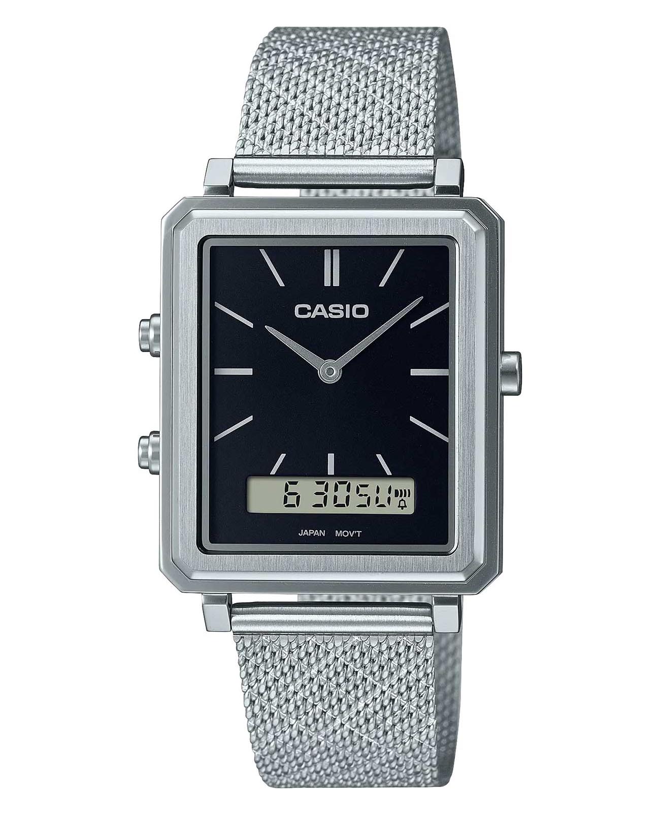 Японские мужские часы- хронографХронографФункция позволяет измерять отрезки времени с особой точностью: часы, минуты, секунды. Верным признаком хронографа является наличие на циферблате 3 дополнительных окошек-счётчиков. с минеральным стекломМинеральное стеклоМинеральное стекло представляет собой искусственно выращенный минерал кварца. Такое стекло отличается особой устойчивостью к повреждениям и царапинам. Уступает по некоторым качествам сапфировому стеклу. Casio Collection MTP-B205M-1EDF, кварцевый механизм с высокой точностью. Корпус часов изготовлен из стали. Мужские аналогово-цифровые часы. 12 и 24-часовой формат времени. СекундомерСекундомерСекундоме́р — прибор, способный измерять интервалы времени с точностью до долей секунды. с точностью показаний 1/100с и временем измерения 60мин. Второй часовой пояс. Циферблат с метками в виде штрихов. БудильникБудильникБуди́льник — часы, в заданный момент времени подающие звуковой, световой и/или в редких случаях другой сигнал., ежечасный сигнал. Батарея рассчитана на 3 года. Класс водозащиты: 50 метров, позволит защитить корпус от случайных брызг или капель дождя. Стальной браслет миланского плетения на раскладном замкеРаскладной замокДанный вариант застежки используется только на часах с металлическим браслетом. Отличительная особенность такого крепления в том, что длина браслета становится универсальной и вы можете самостоятельно отрегулировать нужный вам размер – застежка просто двигается по браслету часов..