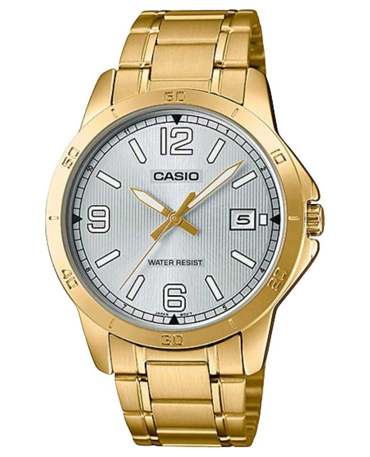 Японские мужские кварцевые часы с минеральным стекломМинеральное стеклоМинеральное стекло представляет собой искусственно выращенный минерал кварца. Такое стекло отличается особой устойчивостью к повреждениям и царапинам. Уступает по некоторым качествам сапфировому стеклу. Casio Collection MTP-V004G-7B2, кварцевый механизм с высокой точностью. Корпус и браслет часов изготовлен из нержавеющей стали с IP-покрытиемIP-покрытиеМетод ионного напыления. Демонстрирует повышенную устойчивость к истиранию, окислению и химическим веществам. Под воздействием высокого давления и температуры около 1500°C молекулы металла надёжно соединяются с частицами корпуса часов..  Циферблат выполнен по технологии Sunray (солнечные лучи). Окошко даты находится в положении 3 часа. Класс водозащиты: 30 метров, позволит защитить корпус от случайных брызг или капель дождя. Стальной браслет на раскладной застёжкеРаскладная застёжкаТакой тип застёжки используется только на браслетах из металла. Она никогда не раскрывается полностью, происходит разделение на 2 и более частей. Раскладывающая застёжка снизит вероятность потери часов к минимуму..