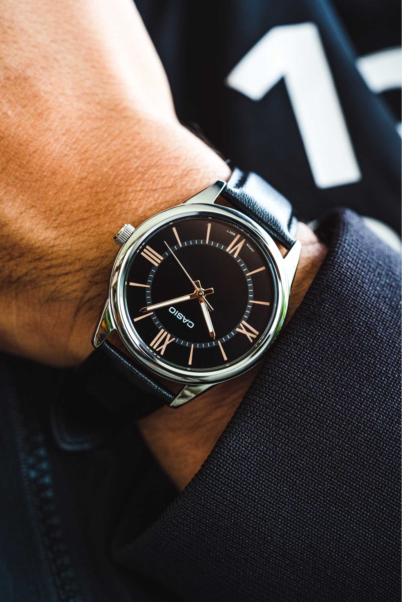 Японские мужские наручные часы с минеральным стекломМинеральное стеклоМинеральное стекло представляет собой искусственно выращенный минерал кварца. Такое стекло отличается особой устойчивостью к повреждениям и царапинам. Уступает по некоторым качествам сапфировому стеклу. Casio MTP-V005L-2B5, кварцевый механизм с высокой точностью. Корпус часов изготовлен из нержавеющей стали. Циферблат с метками в виде штрихов и римских цифр. Стрелки с люминесцентной подсветкойЛюминесцентное покрытиеПозволяет считывать показания времени в темноте. Производители наносят на стрелки, часовые индексы, безель или поверхность циферблата светонакопительный состав, дающий холодное свечение.. Класс водозащиты: 30 метров, позволит защитить корпус от случайных брызг или капель дождя. Кожаный ремешок на стандартной застёжке.