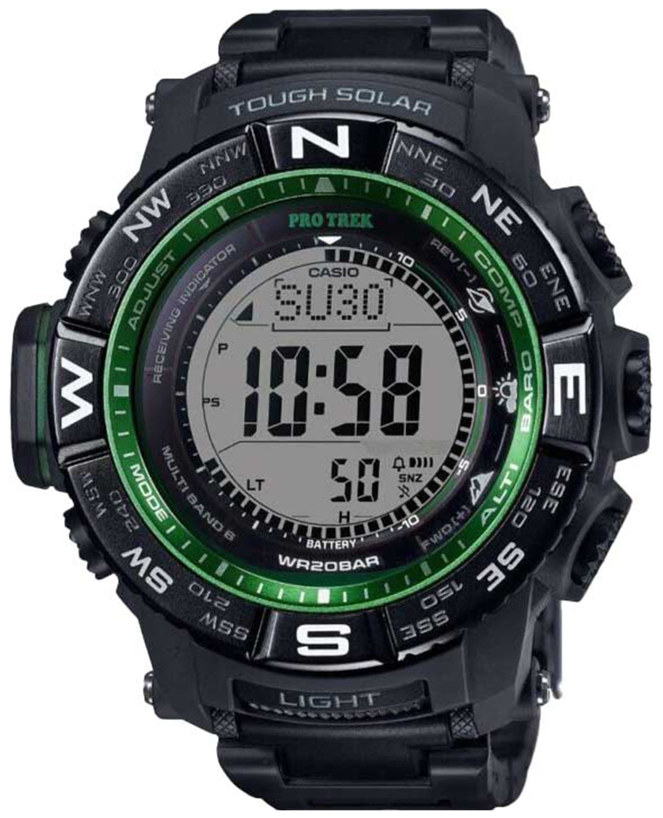 Описание часов Casio Protrek PRW-3510FC-1 -  многофункциональные японские мужские наручные часы. Круглый корпус часов выполнен из темного пластика, безель из стали, резиновый браслет. Инверсионный, жидкокристаллический дисплей. Часы оснащены такими дополнительными функциями как cекундомерСекундомерСекундоме́р — прибор, способный измерять интервалы времени с точностью до долей секунды., таймерТаймерОтсчитывает секунды в обратном направлении в заданном интервале времени., высотометр, термометр, компас, альтиметр. Минеральное стеклоМинеральное стеклоМинеральное стекло представляет собой искусственно выращенный минерал кварца. Такое стекло отличается особой устойчивостью к повреждениям и царапинам. Уступает по некоторым качествам сапфировому стеклу. устойчивое к мелким механическим повреждениям. Магнитоустойчивая, ударопрочная модель. Источником энергии служат солнечные батареи Tough SolarTough SolarТехнология основана на подзарядке аккумулятора от источника солнечного света, специальная панель улавливает солнечные лучи и преобразует их в энергию для работы часов. Достаточно пары минут нахождения на солнце для функционирования часов в течении суток.. Синхронизация времени по радиосигналу.