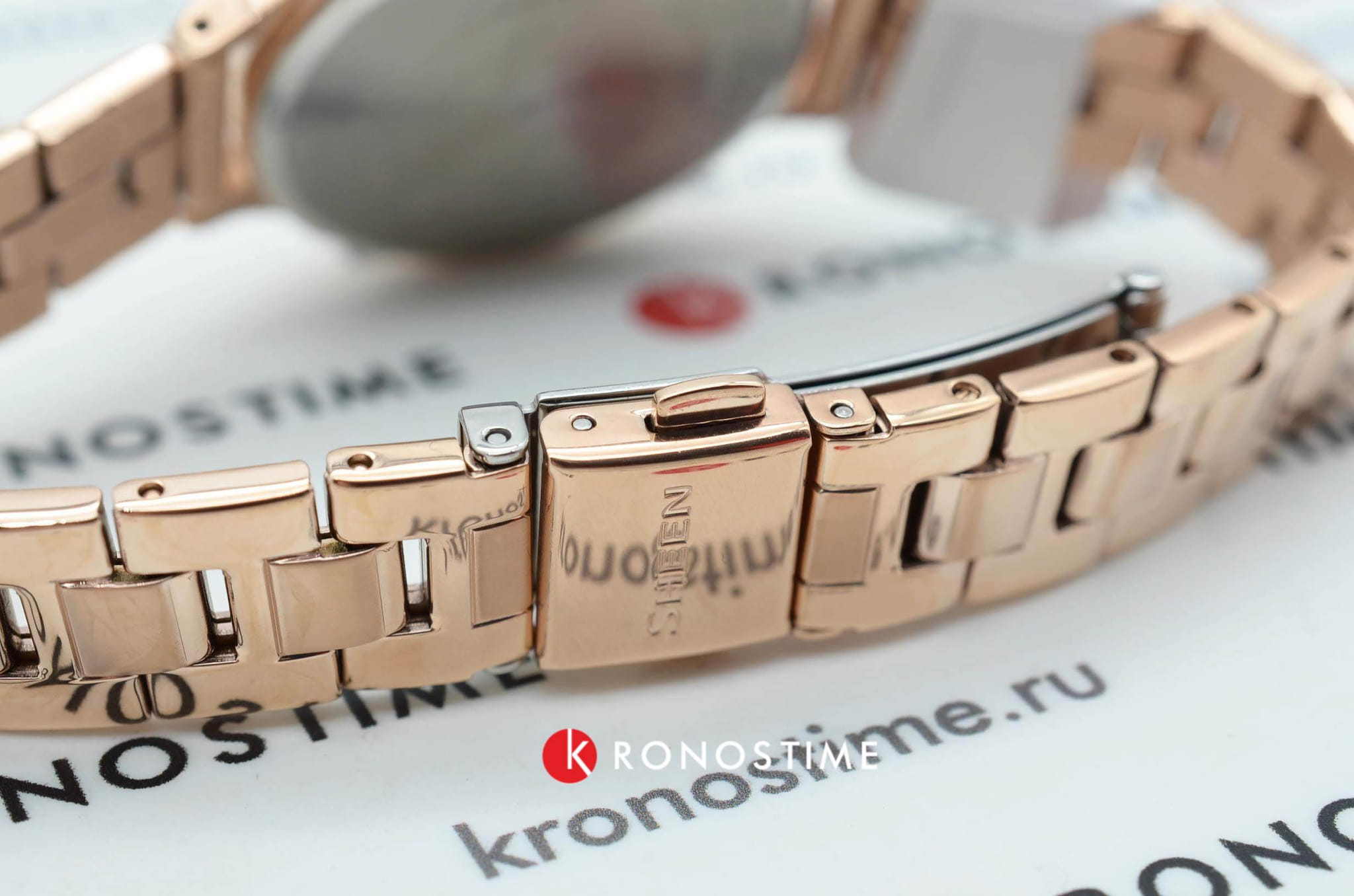 Японские женские часы с сапфировым стекломСапфировое стеклоПрочный и надёжный материал из кристалла сапфира синтетического происхождения, характеризующийся особой твёрдостью и устойчивостью к царапинам и повреждениям. Casio Sheen SHE-4550PG-4A, кварцевый механизм с высокой точностью. Яркий и привлекательный стиль этих часов гармонично дополнит ваш нежный образ. Корпус и браслет часов извотолвены из стали с IP-покрытиемIP-покрытиеМетод ионного напыления. Демонстрирует повышенную устойчивость к истиранию, окислению и химическим веществам. Под воздействием высокого давления и температуры около 1500°C молекулы металла надёжно соединяются с частицами корпуса часов.. Циферблат с текстурой морской волны, которая оставила свой след на фоне золотистого песка. У отметки семи часов циферблат дополнительно украшен кристаллом. Стрелки с люминесцентным покрытиемЛюминесцентное покрытиеПозволяет считывать показания времени в темноте. Производители наносят на стрелки, часовые индексы, безель или поверхность циферблата светонакопительный состав, дающий холодное свечение.. Класс водозащиты: 50 метров, позволит защитить корпус от случайных брызг или капель дождя. Браслет на раскладной застёжкеРаскладная застёжкаТакой тип застёжки используется только на браслетах из металла. Она никогда не раскрывается полностью, происходит разделение на 2 и более частей. Раскладывающая застёжка снизит вероятность потери часов к минимуму..
