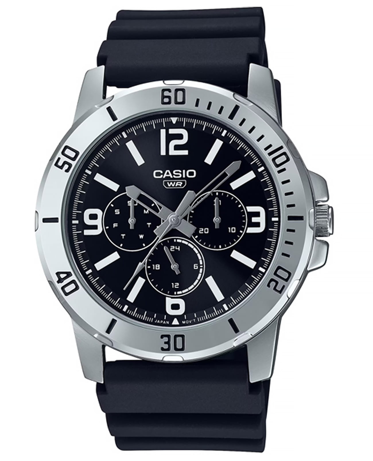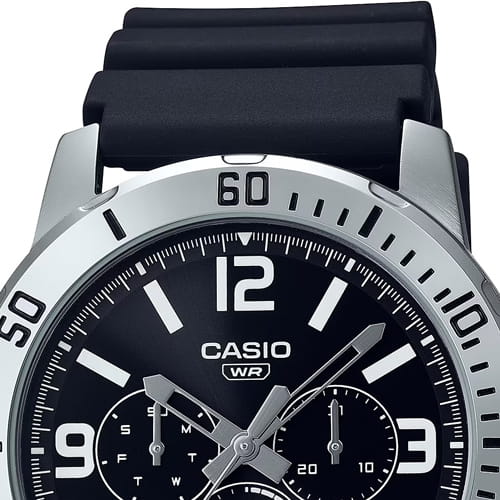 Японские мужские часы-хронографХронографФункция позволяет измерять отрезки времени с особой точностью: часы, минуты, секунды. Верным признаком хронографа является наличие на циферблате 3 дополнительных окошек-счётчиков. с минеральным стекломМинеральное стеклоМинеральное стекло представляет собой искусственно выращенный минерал кварца. Такое стекло отличается особой устойчивостью к повреждениям и царапинам. Уступает по некоторым качествам сапфировому стеклу. Casio Collection MTP-VD300-1B, кварцевый механизм с высокой точностью. Класс водозащиты: 50 метров, позволит защитить корпус от случайных брызг или капель дождя. Корпус часов изготовлен из стали. Силиконовый ремешок на стандартной застёжке. Окошко даты находятся в положении 3 часа. Указатели дня недели и даты расположены в центре циферблата.